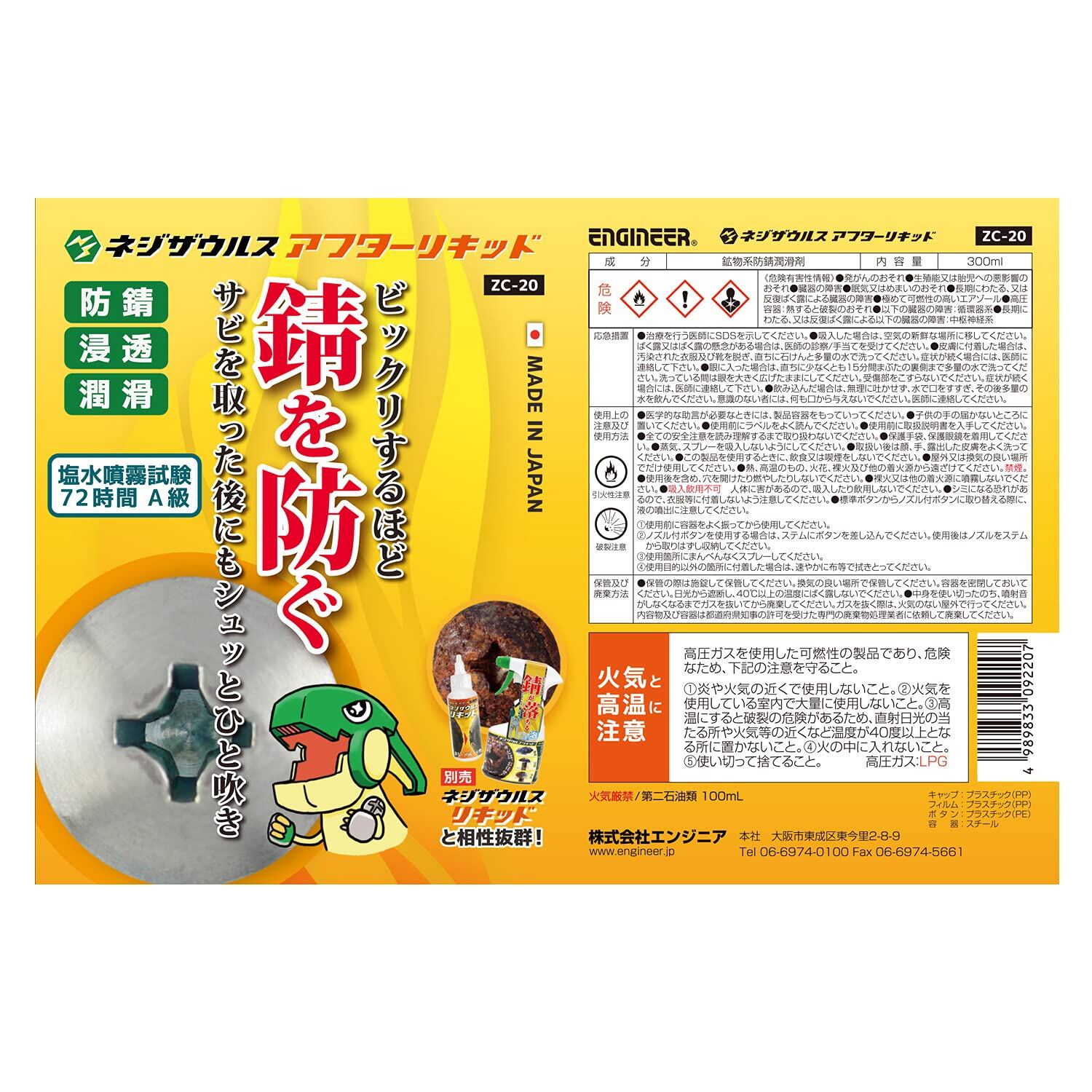 ENGINEER エンジニア ネジザウルスアフターリキッド 防錆・浸透・潤滑剤 塩水噴霧試験72時間A級 水置換性 耐樹脂性 スプレータイプ 300g ZC-20
