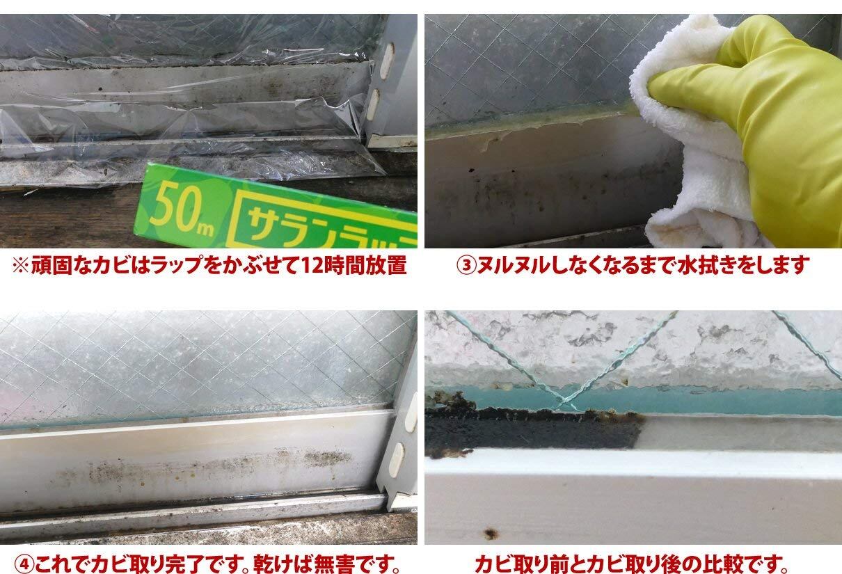 * 【除去後の防カビ効果】目に見えないカビの菌糸や薬品に耐性を持った塩素耐性菌まで除去するため、次のカビが生えづらく、最長3か月程度の防カビ効果が期待できます。