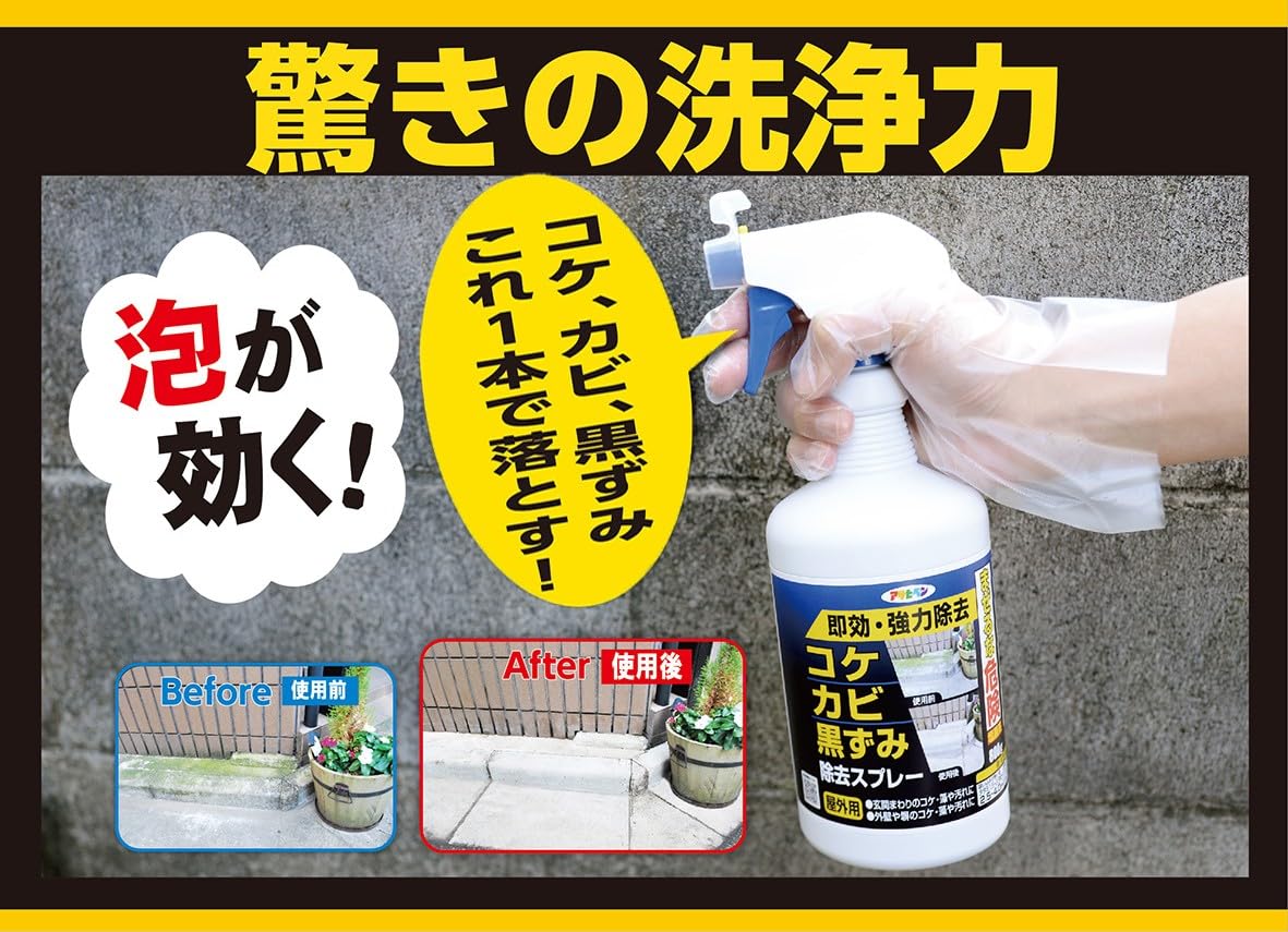 * 用途:コンクリート、レンガなどの外壁、塀に付着したコケ、カビ汚れ、黒ずみ、藻の除去。