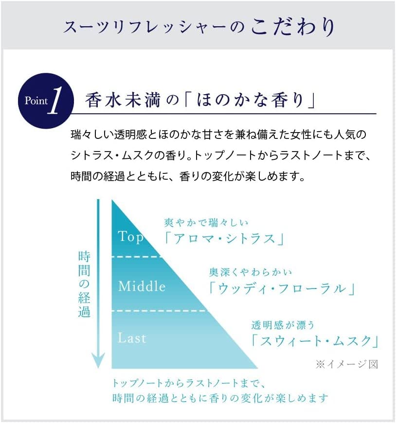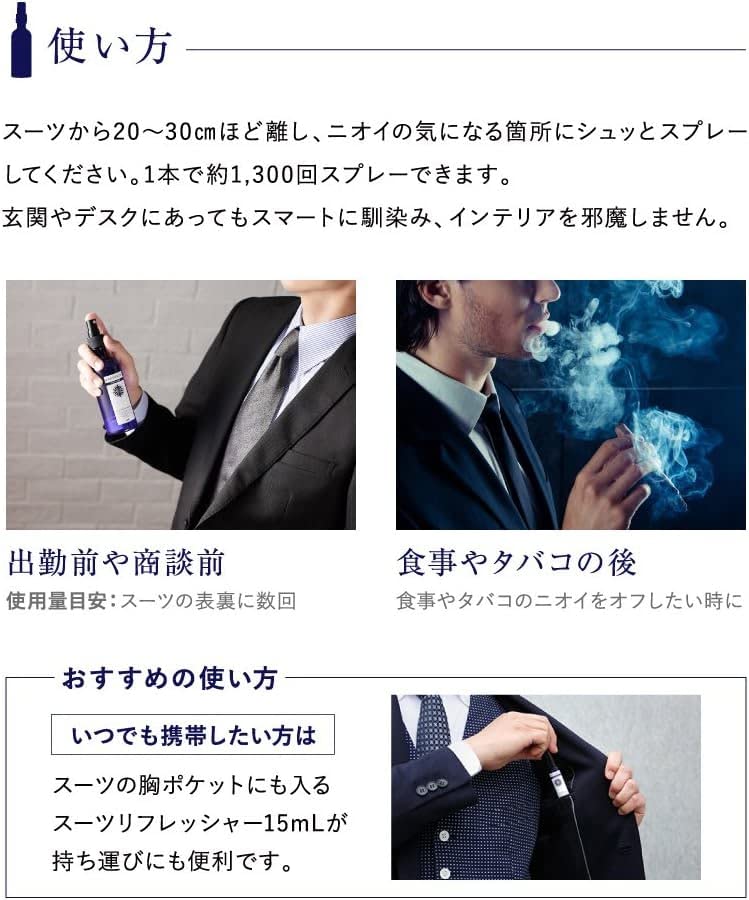 * 【使い方】出勤前や商談前、食事やタバコの後にスーツから20~30cmほど離し、ニオイの気になる箇所にシュッとスプレーしてください。