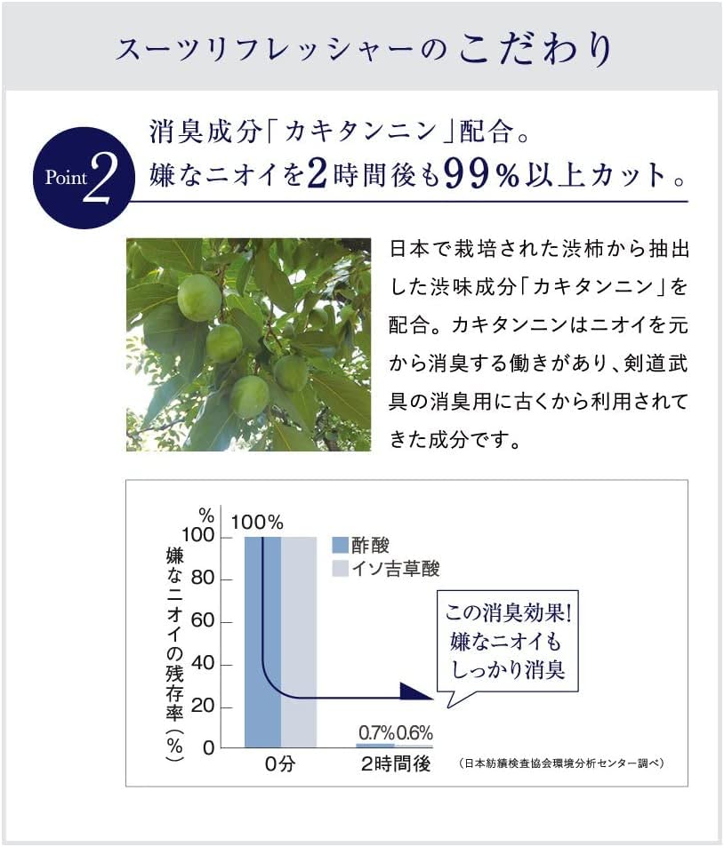 * 【消臭成分「カキタンニン」配合。 嫌なニオイを2時間後も99%以上カット】日本で栽培された渋柿から抽出した渋味成分「カキタンニン」を配合。カキタンニンはニオイを元から消臭する働きがあり、剣道武具の消臭用に古くから利用されてきた成分です。