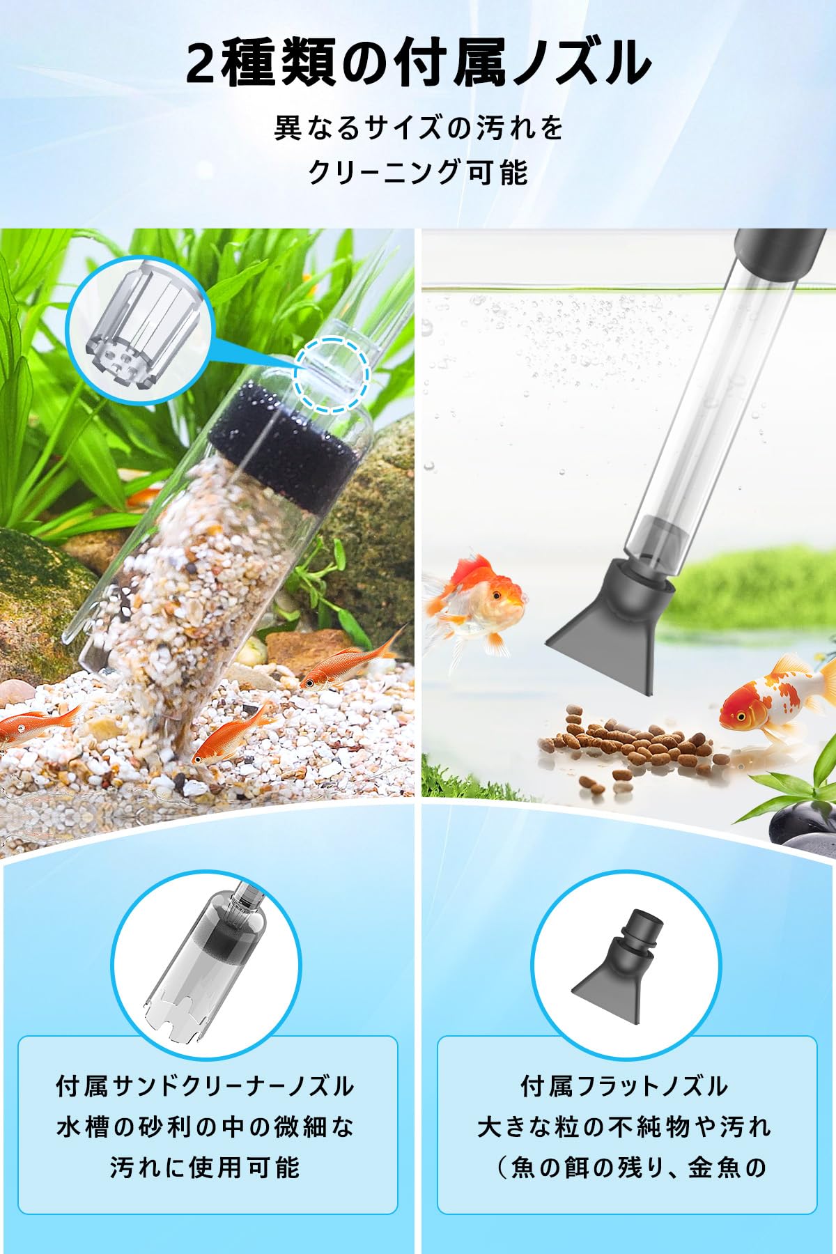 * 【シンプルかつ効率的な砂利掃除&水換え】 AQQAの手動式水槽用水換えポンプは、水換え・砂利洗浄・汚れ掃除を一体化した多機能タイプで、日常のアクアリウム管理を簡単にします。本製品には2種類の専用ノズルが付属しており、用途に応じて使い分けが可能です。砂利掃除ノズルは、水槽の底砂に混ざった微細な汚れを効果的に吸い出すことができ、内部のフィルタースポンジにより、レイアウト用の砂利や石が吸い込まれるのを防止します。一方、吸水ノズルは、底に溜まった餌の食べ残しや魚のフンなど、大きなゴミをしっかりと吸引可能です。水流は調整可能で、効率よく水換え・清掃作業を進められるため、面倒な水槽メンテナンスをよりスムーズに行えます。