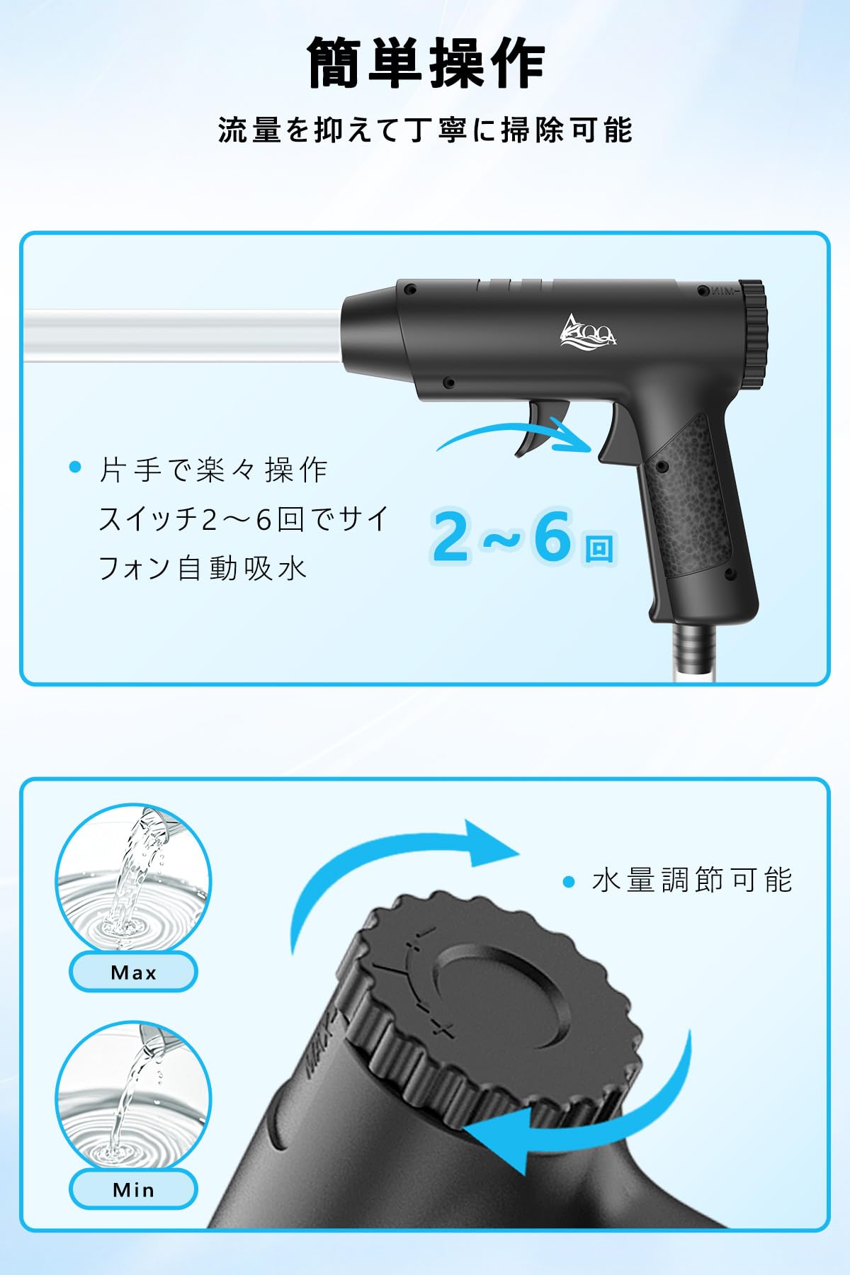 * 【流量調節機能付きで、より丁寧な水槽掃除が可能】 水槽用水換えは、水流量の調節が可能な設計で、状況に応じて排水スピードを自在にコントロールできます。最大流量は6.7L/分、最小流量は0.67L/分と、幅広い調整幅を実現しています。一一般的な一定流量の水換え器とは異なり、AQQAの手動式水換え器は流量の調整が可能です。排水量を自分でコントロールできるため、常に最大水流で排水されることがなく、水槽内の砂利や隅にたまった汚れを丁寧に掃除する十分な時間を確保できます。底砂の隙間にある汚れや残餌などをしっかり取り除けるため、細かなメンテナンスを重視するユーザーにも最適です。