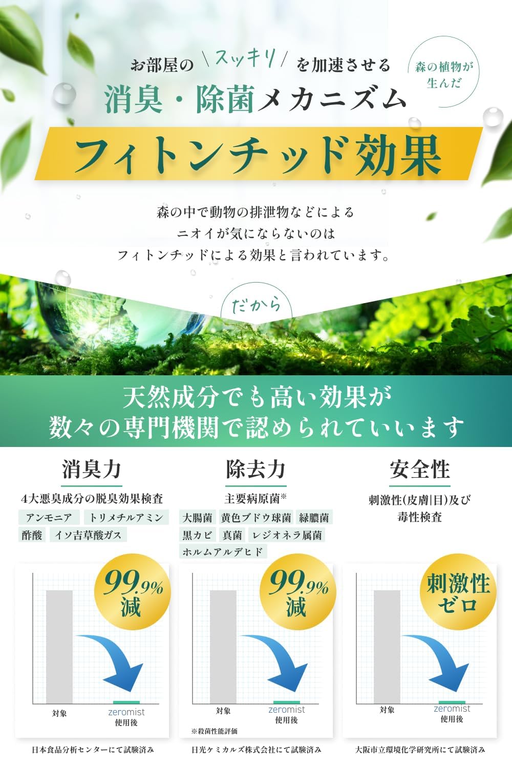* 【数々の専門機関が認めた消臭剤 × 専門機関が明らかにした悪臭無効化システム】Zeromistはニオイでごまかすのではなく“ニオイの元からしっかり除去”するのでニオイ戻りしにくいのも1つの特徴です。除菌・消臭・安全性に対し、計5社で成分の効果測定を実施し、効果を実証しています。