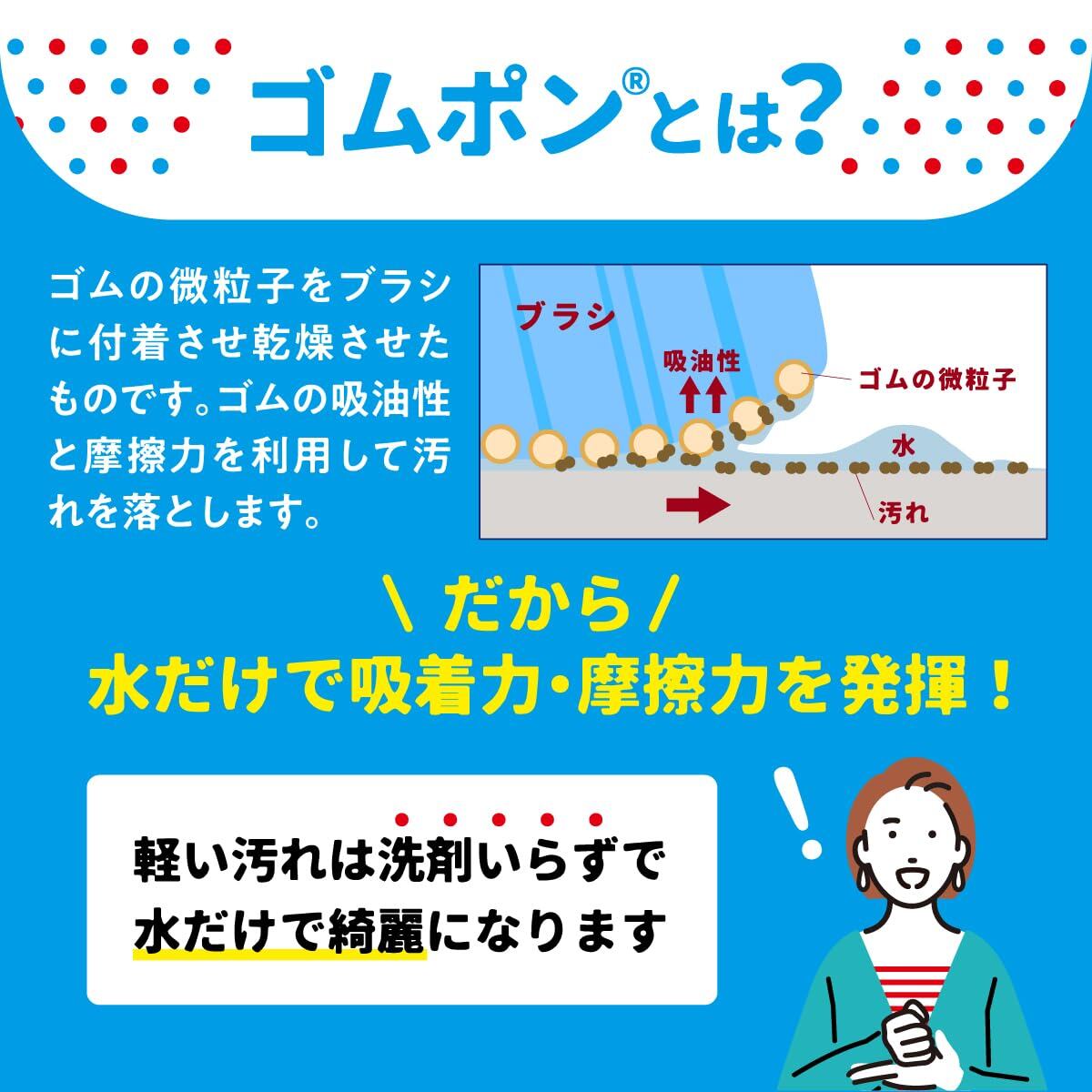 * 今までのゴムは吸油性と摩擦力があり、ゴムポンは、油汚れなどを吸着・摩擦力により、 洗剤なしで今までにない力で落とす事を可能にしました。スポンジや、ブラシと違いゴムの微粒子を表面にコーティング。