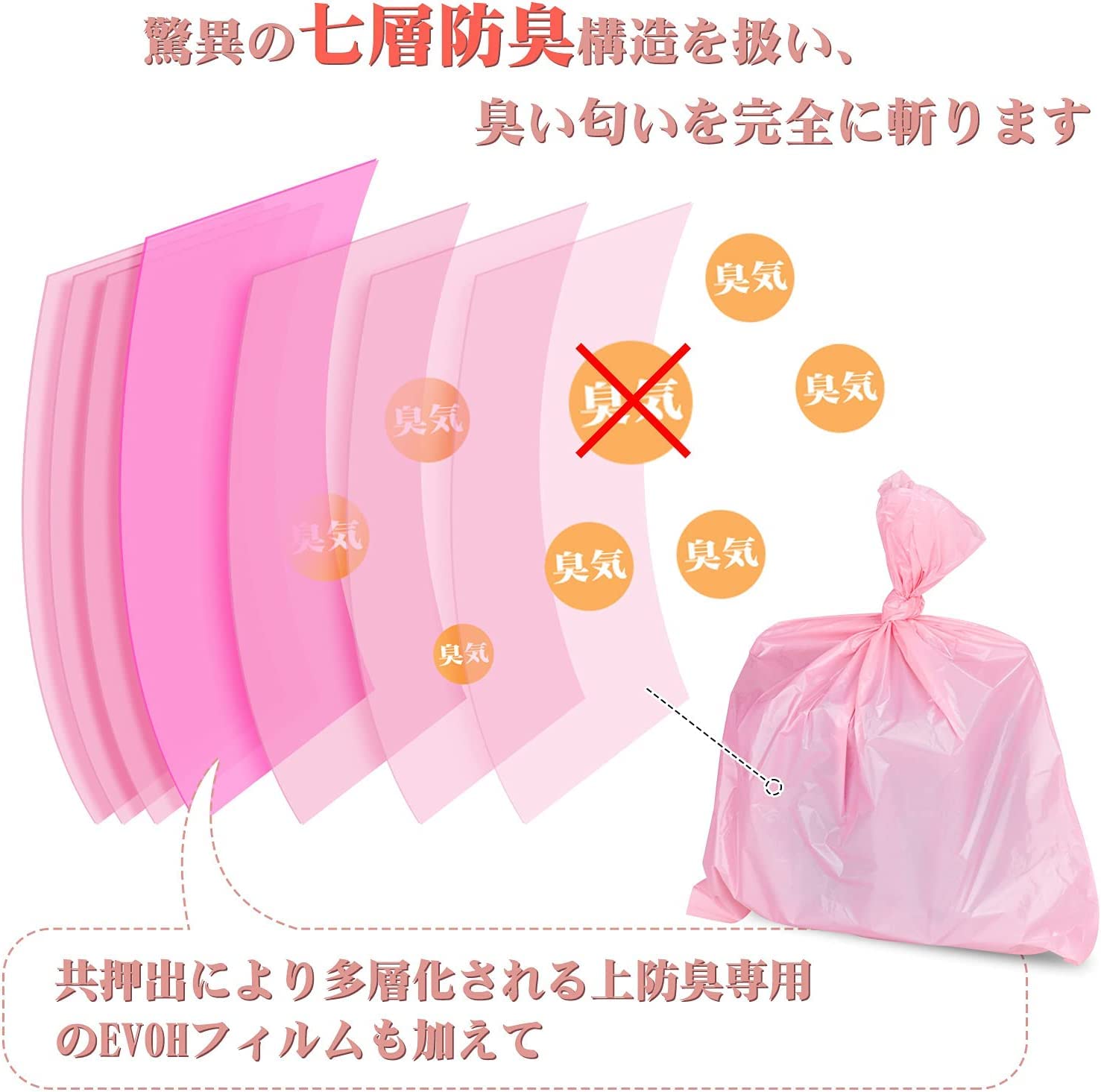 本社特有革新的な技術で多層のフィルム(PE)とEVOHフィルム(防臭フィルム)共押出により多層化される匂いを完全に抑えらる超強力な「ニオイ斬り」防臭袋です。