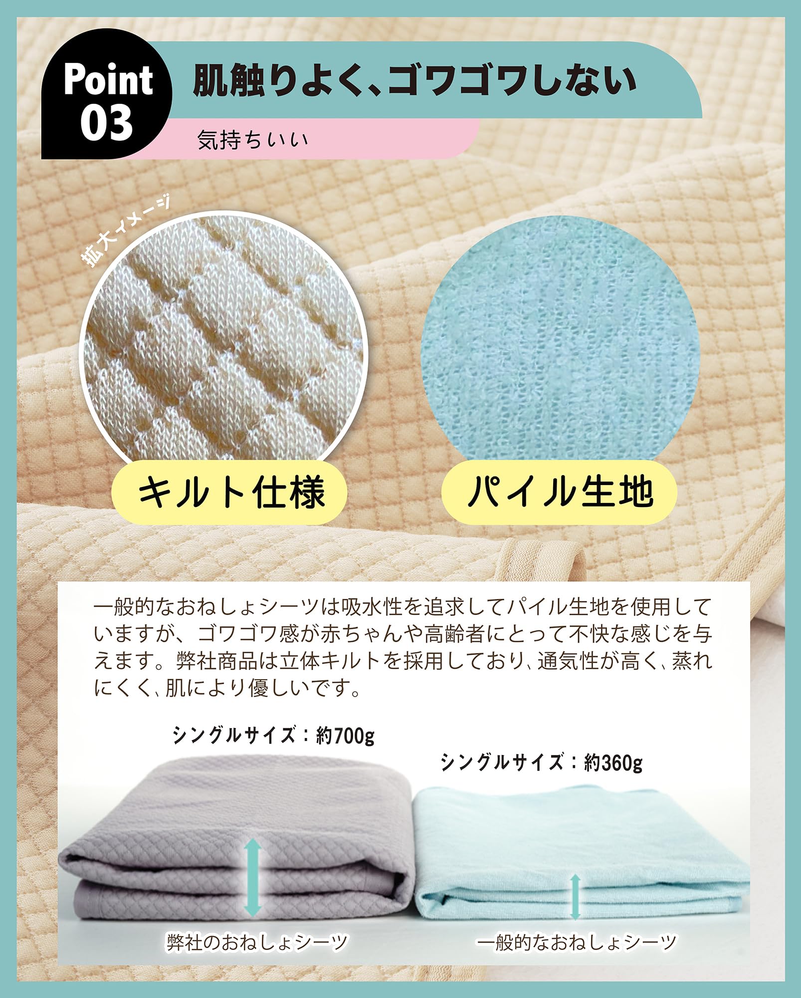 やさしい肌触りと優れた防水性、通気性のよさを兼ね備えた肌にやさしいおねしょシーツです。