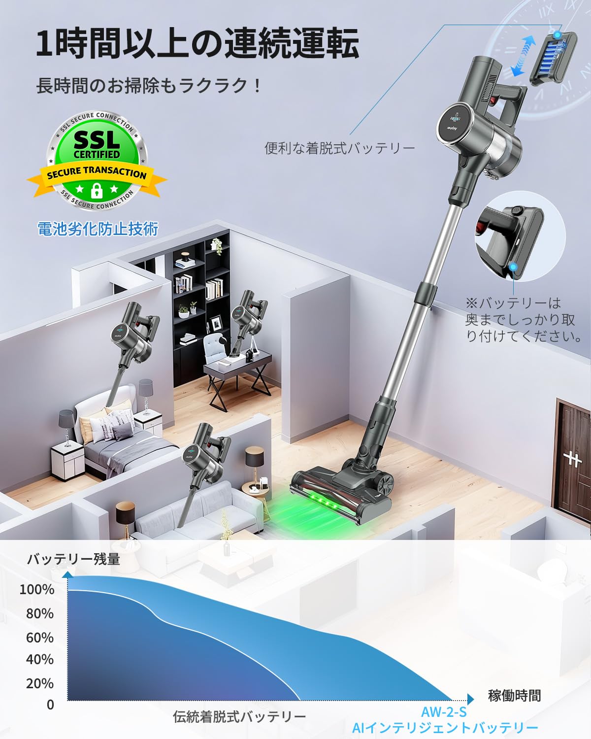 1L大容量ダストカップはワンタッチでゴミ捨てでき、過熱保護・電池劣化防止AI機能によりバッテリー寿命も長持ちします。