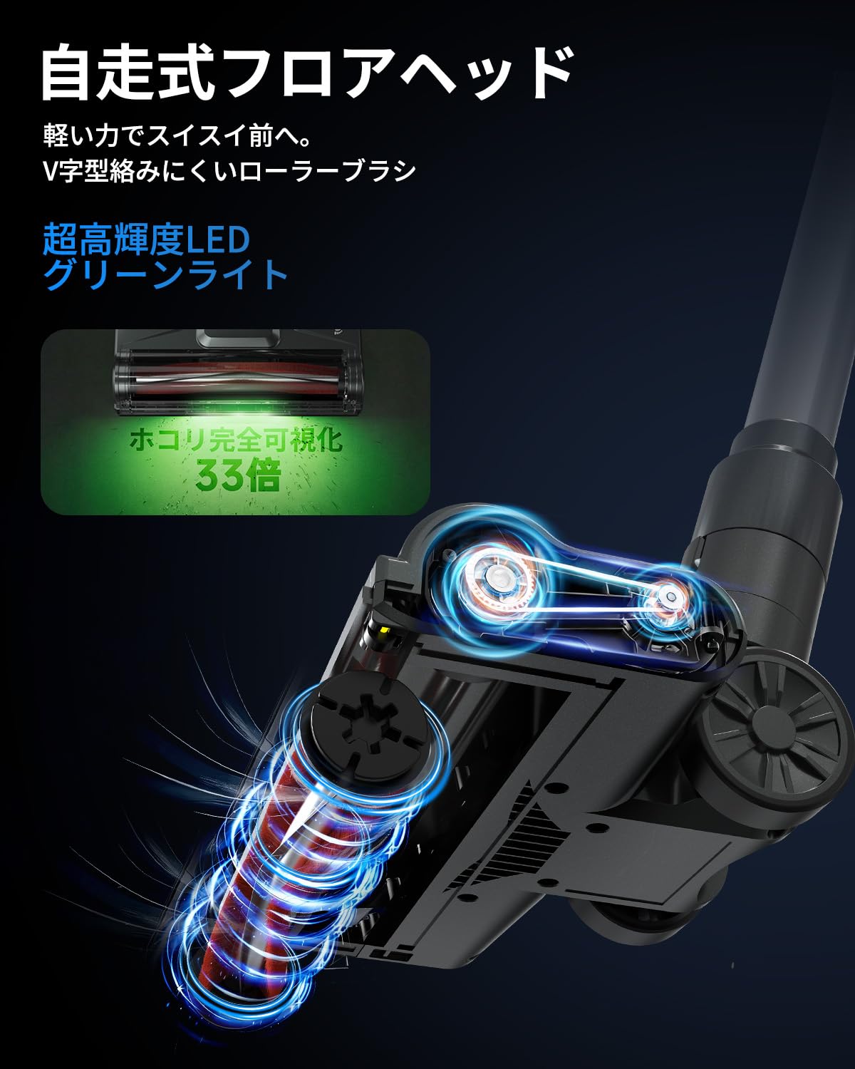 ■ 【LEDグリーンライトでホコリを33倍可視化 × 零隙間高機動ヘッド】 高輝度LEDグリーンライトが暗い場所のホコリを最大33倍可視化。