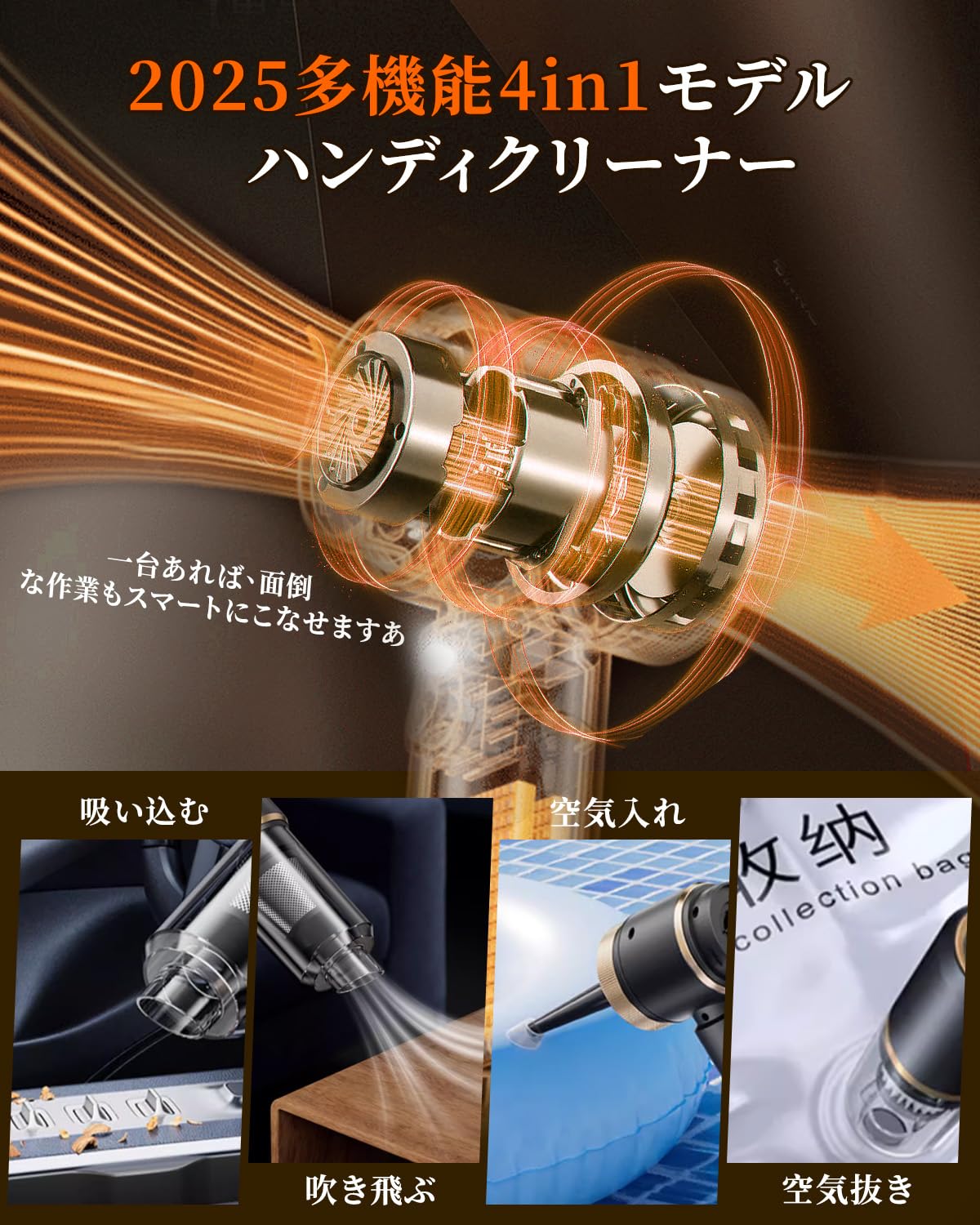 ■ ①【4in1多機能&7種ノズルで幅広く対応】 吸引・送風・空気入れ・空気抜きの4つの機能を1台に集約。