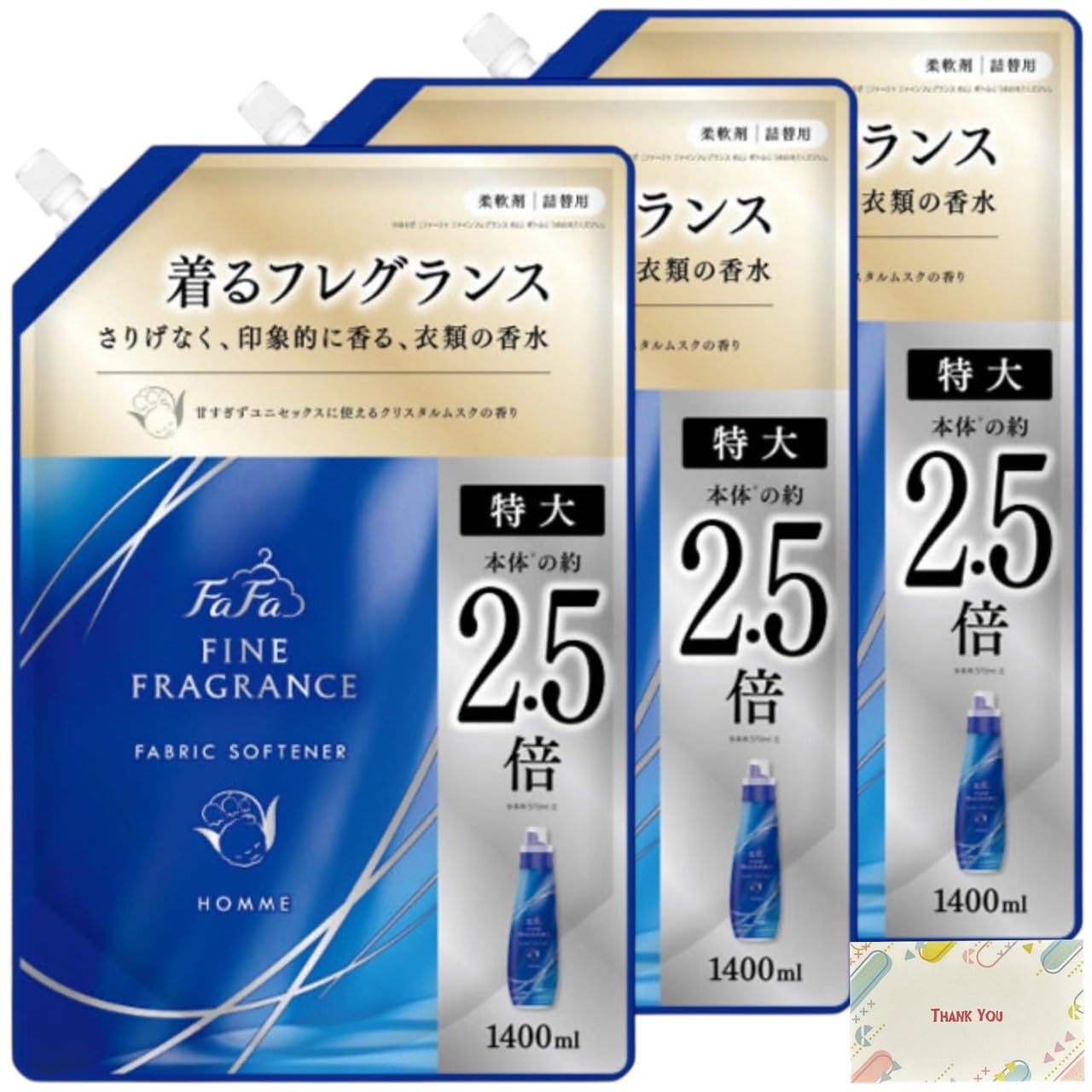 Kunutonn ファーファ ファインフレグランス 柔軟剤 詰め替え 大容量 1400ml + オリジナルロゴ入りeおまけ付 オム クリスタルムスクの香り 3袋セット
