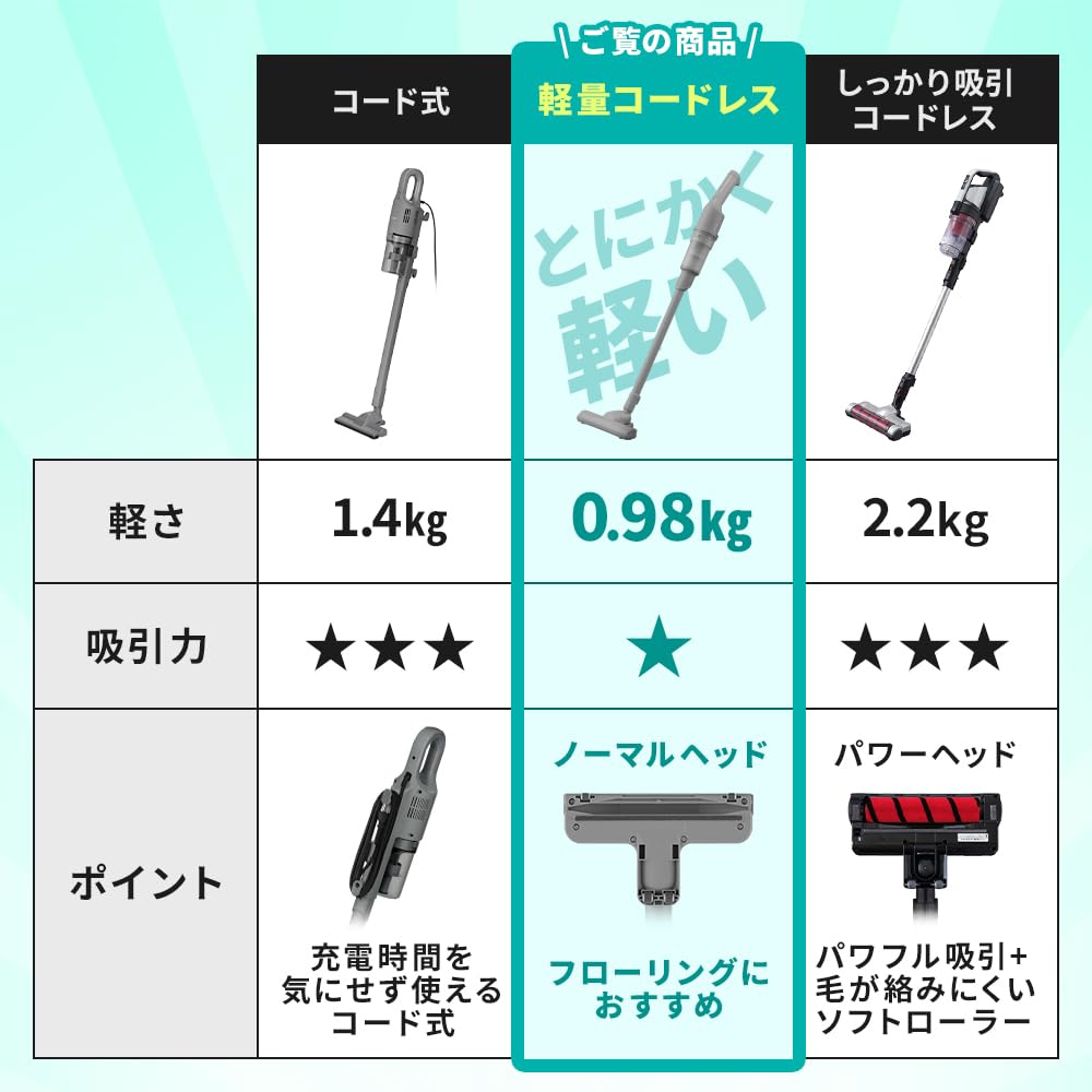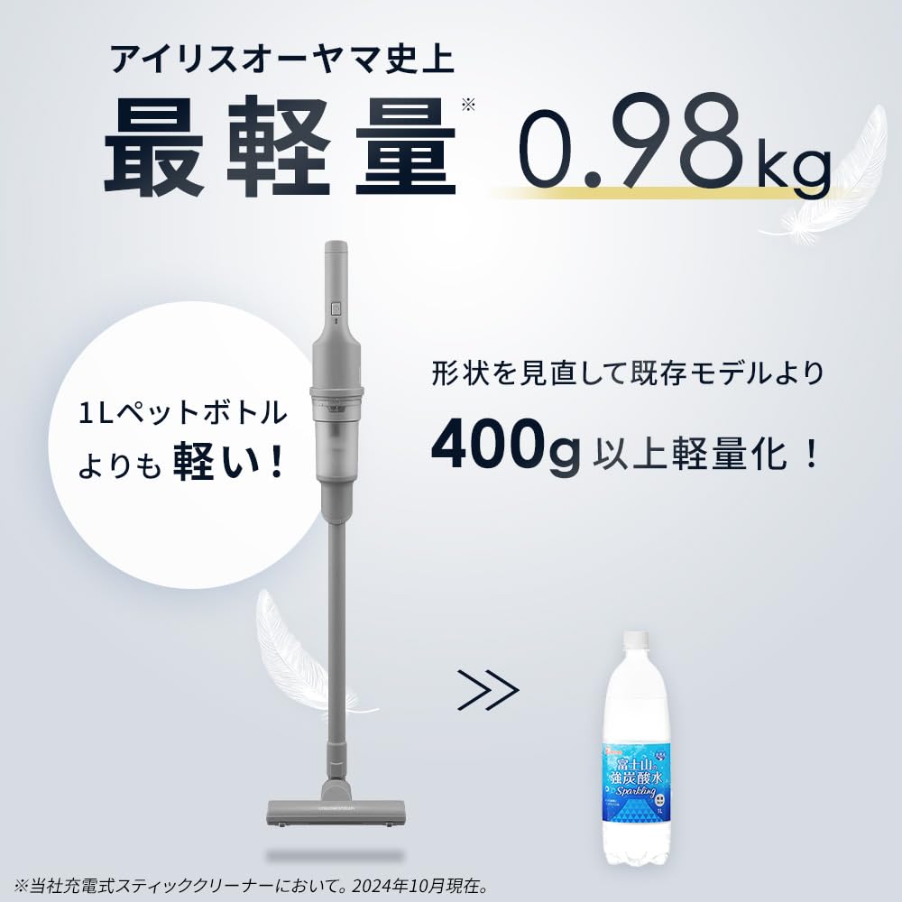 アイリスオーヤマ史上最軽量0.98kg ※アイリスオーヤマ充電式スティッククリーナーにおいて。