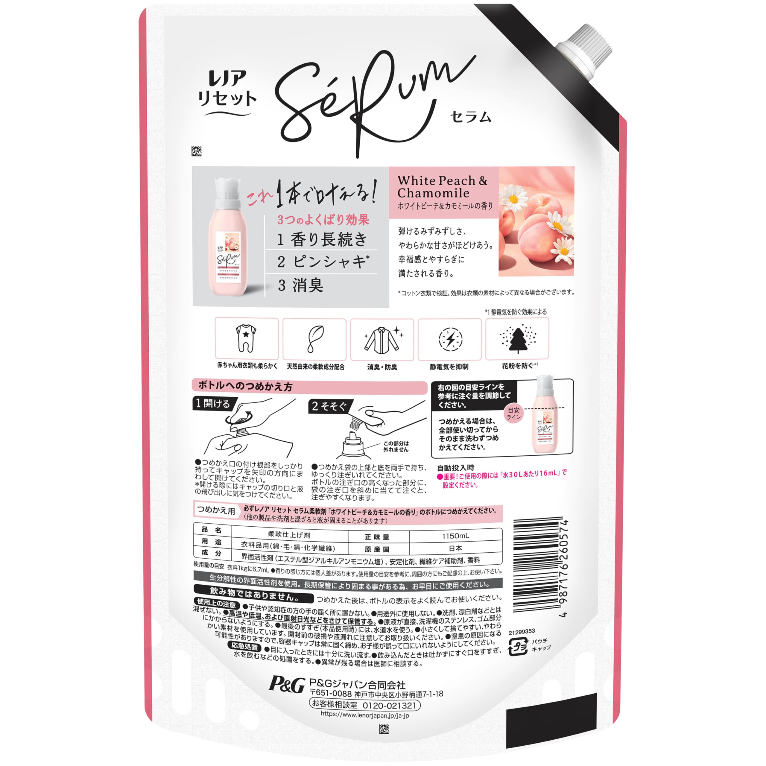 レノア Lenor リセット セラム 柔軟剤 ホワイトピーチ&カモミール 詰め替え 1,150mL×6袋 [大容量] [ケース品]