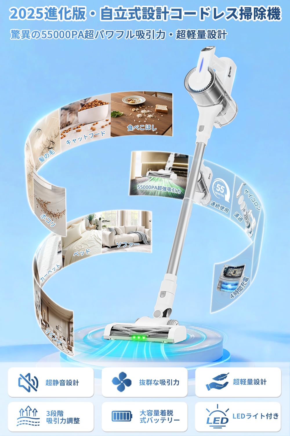 ■ 【55000pa超強吸引力&自立式設計&軽量設計】55000paの超強吸引力を持つこの掃除機は、高効率な清掃のために設計されています。