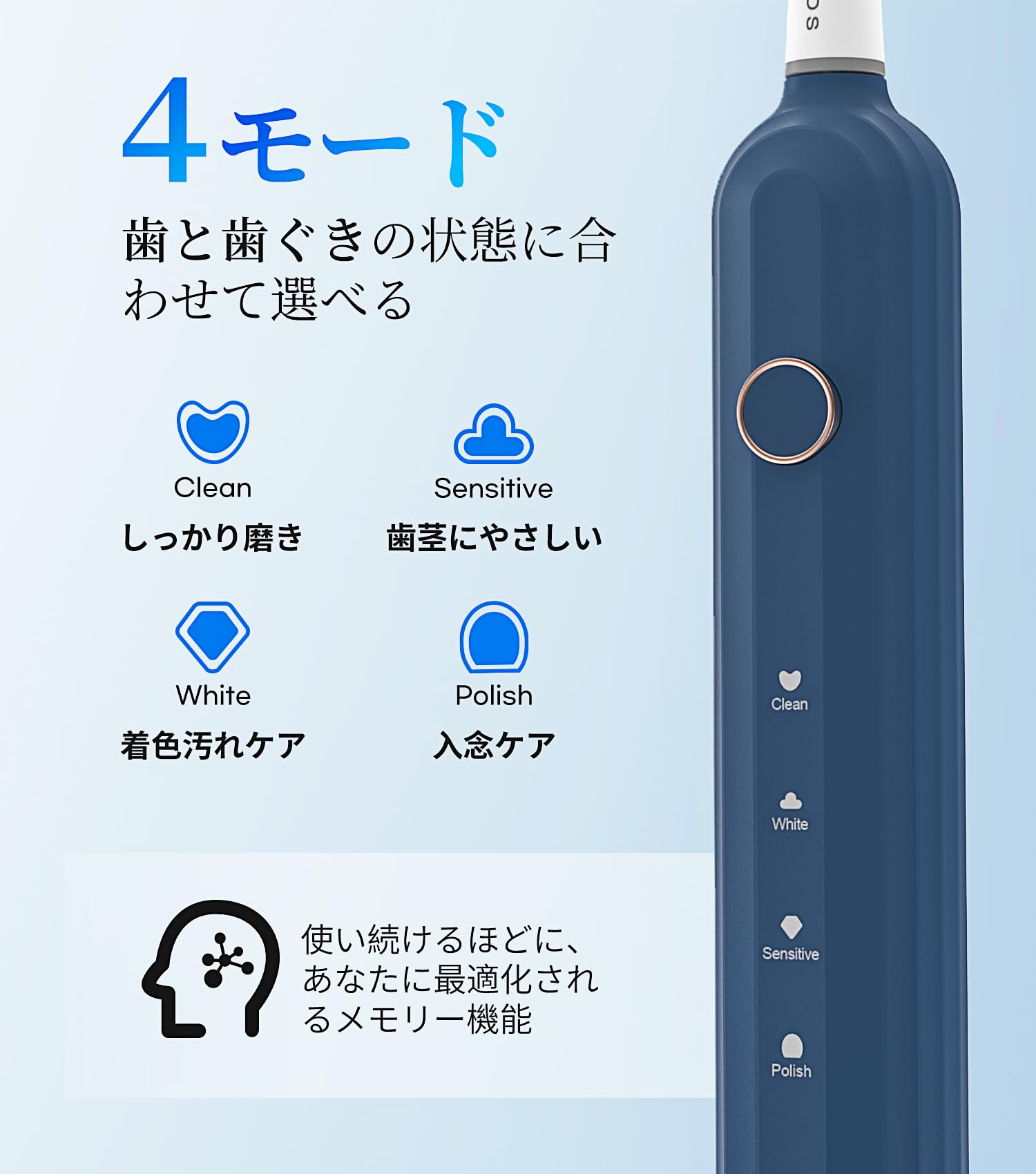 バッテリーが切れそうな時にはお知らせ可能、前回使用したブラッシングモードを記憶する機能が付きます。