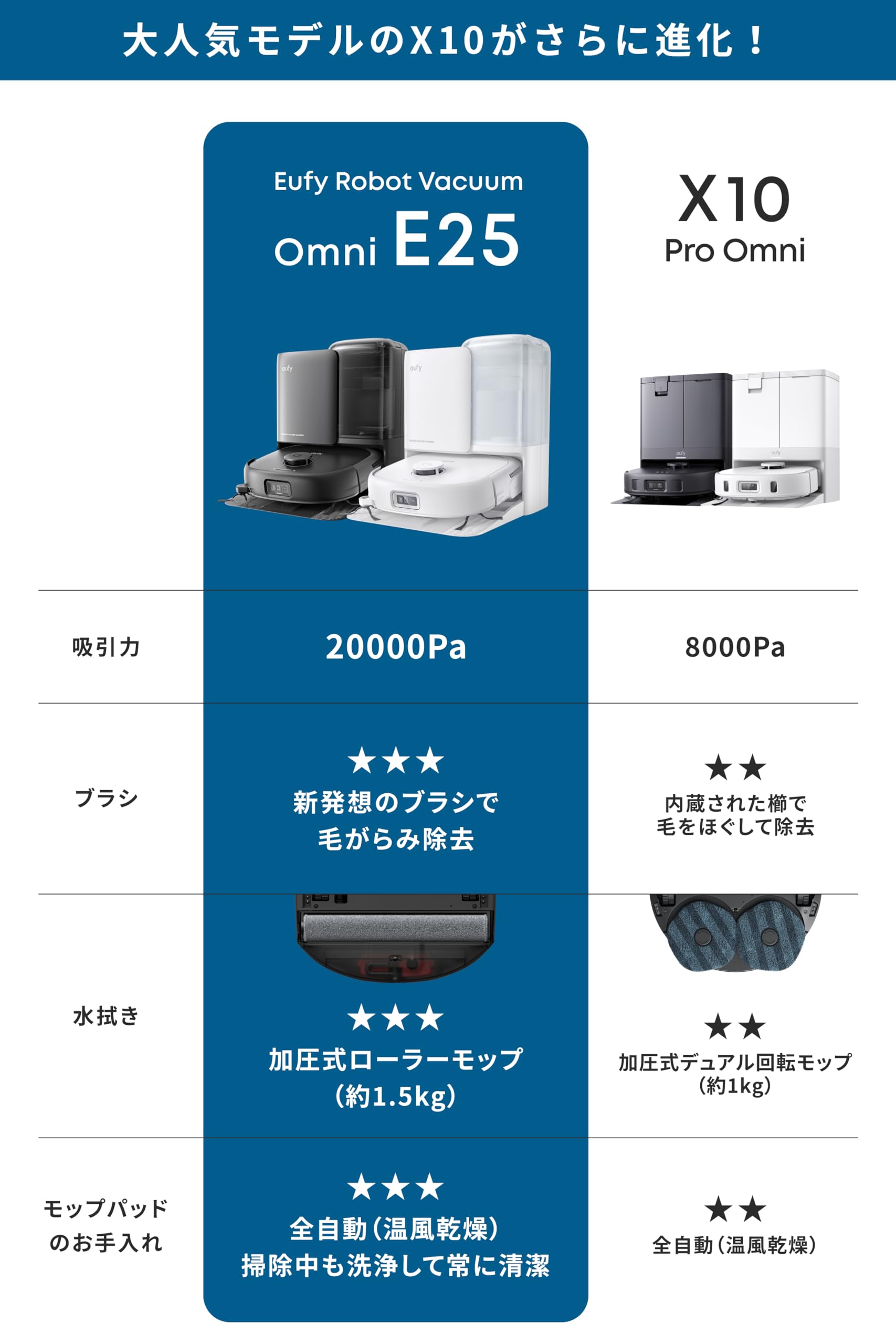 Anker Eufy (ユーフィ) Robot Vacuum Omni E25 (ロボット掃除機)【ローラーモップ/全自動クリーニングステーション/自動ゴミ収集/モップ洗浄・乾燥 / 20000Pa 吸引力/モップリフト/洗剤投入/水拭き/マッピング/AIカメラ 障害物回避/毛がらみ除去/伸縮サイドブラシ/アプリ操作】ホワイト