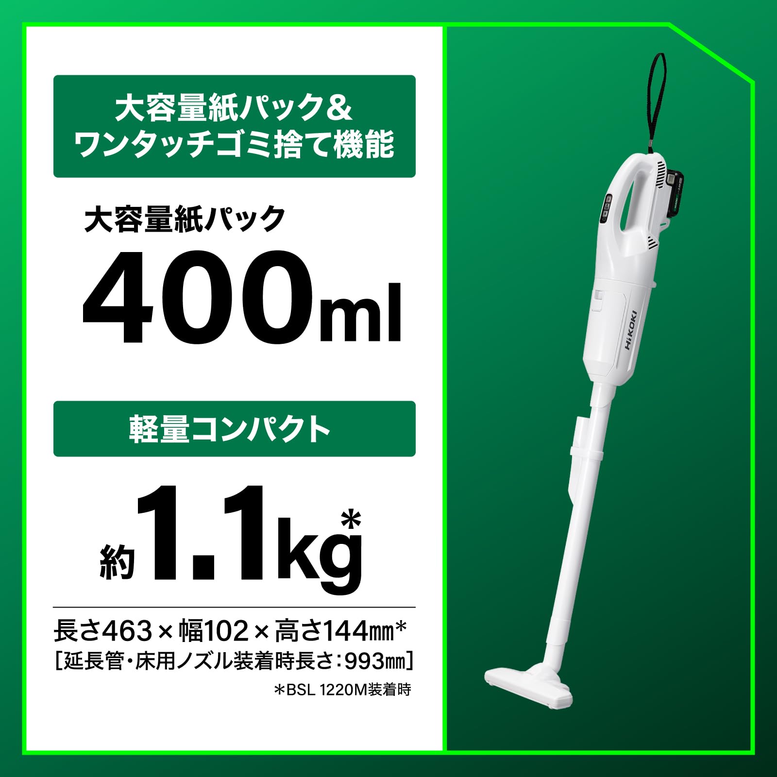 HiKOKI(ハイコーキ) 10.8V 充電式 クリーナー R12DPA 紙パック式 軽量1.1kg ホワイト 蓄電池・充電器付 R12DPA(BSW)