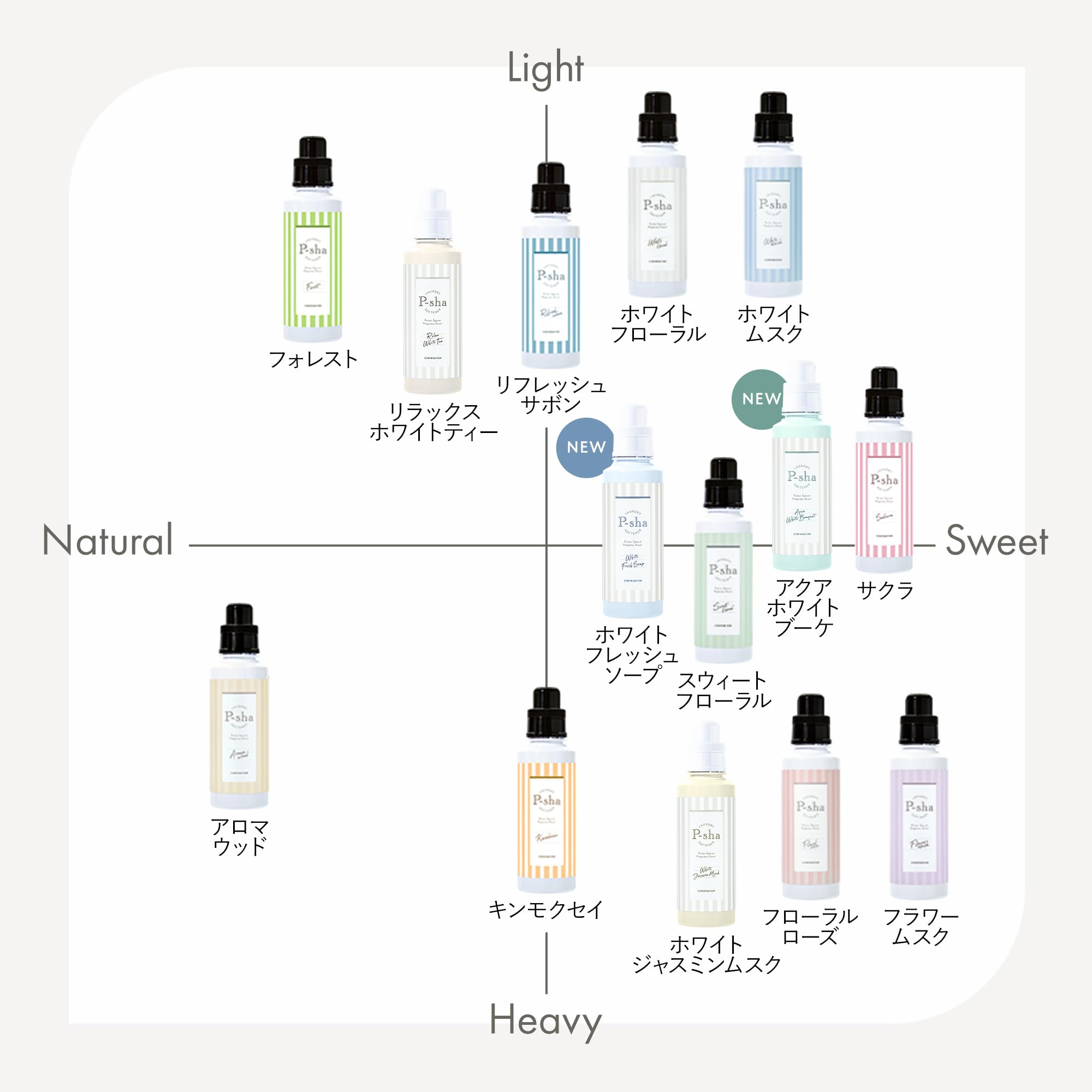■ 全14種類の香り:ホワイトフローラル、アロマウッド、ホワイトムスク、スウィートフローラル、フラワームスク、フローラルローズ、キンモクセイ、フォレスト、サクラ、リフレッシュサボン、リラックスホワイトティー、ホワイトジャスミンムスク、アクアホワイトブーケ、ホワイトフレッシュソーブ