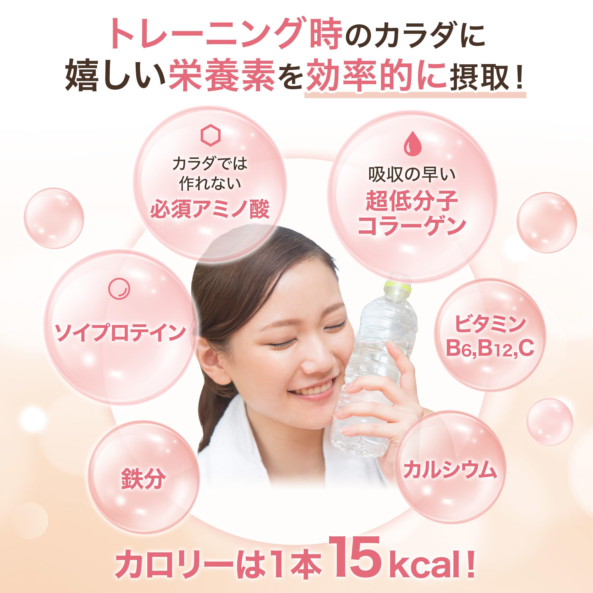 ■ 一般的なコラーゲンより吸収の早い超低分子コラーゲンを独自配合しており、鉄分・カルシウム、運動に大切なビタミンB6、ビタミンB12、ビタミンCなど、女性に嬉しい栄養素が手軽に摂取できる、