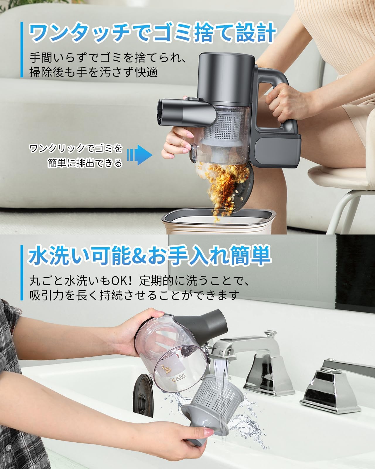 さらに、ダストカップは取り外して分解可能で、丸ごと水洗いもOK!定期的に洗うことで、吸引力を長く持続させることができます。