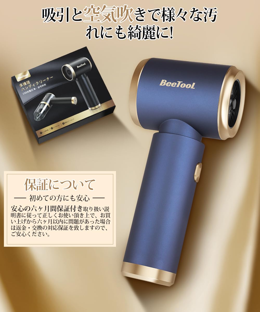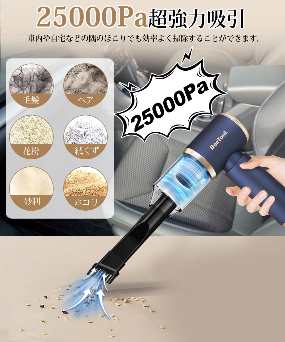 【新登場】ハンディクリーナー 多機能 車用掃除機 コードレス 25000Pa 強力吸引力 BeeTool【吹き飛ぶ/吸い込む/空気入れ/空気抜き】ハンディ掃除機 パワフル 長時間稼働 超軽量0.36kg 乾湿両用 小型 USB充電式 メーカー保証付 人気 業務用/車用清掃/家具/家庭用 日本語説明書付 ZX-106 ネイビー