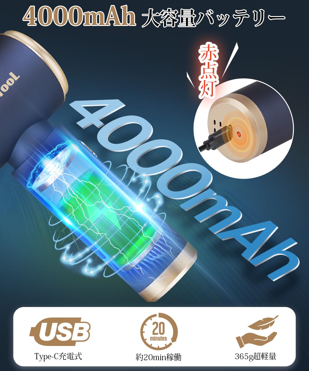 ■ 【4000mAh内蔵バッテリー・USB充電式】ハンディ掃除機は大容量4000mAhバッテリーが内蔵され、約3.5時間のフル充電で20分連続使用可能です。