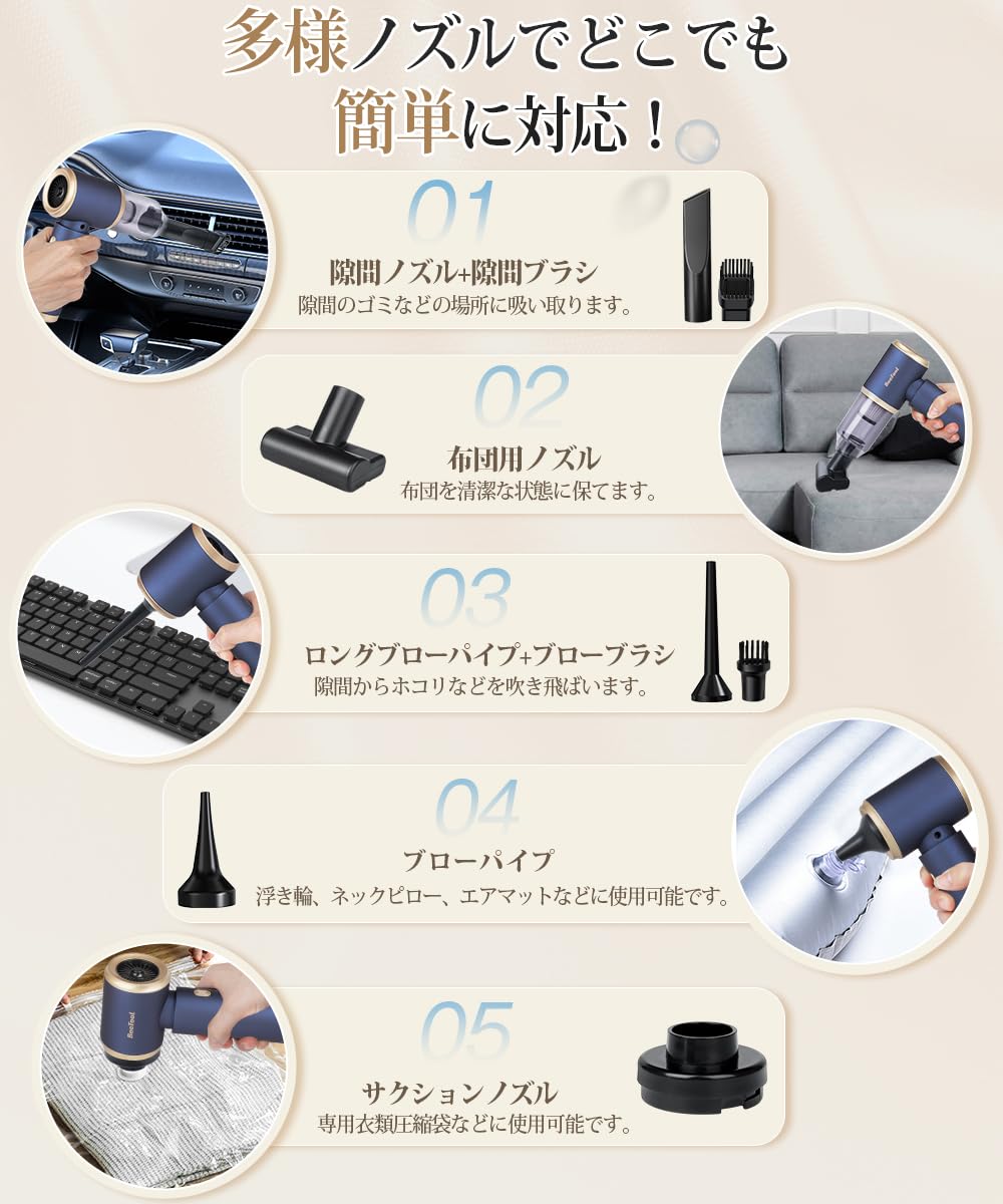ソファの隙間、キーボード、車内掃除、ネックピロー、エアベッド、エアボート、専用衣類圧縮袋などの場所に使用可能です。