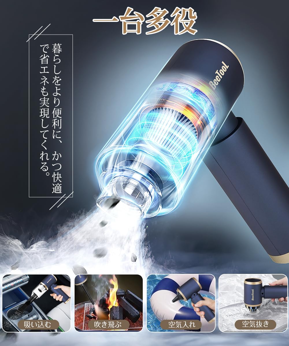 BeeToolのハンディクリーナーはミニ掃除機/エアダスター/電動エアーポンプとして利用可能です。
