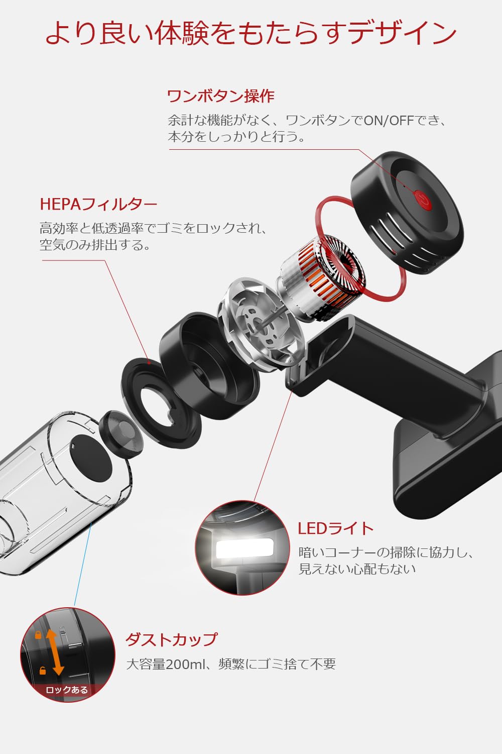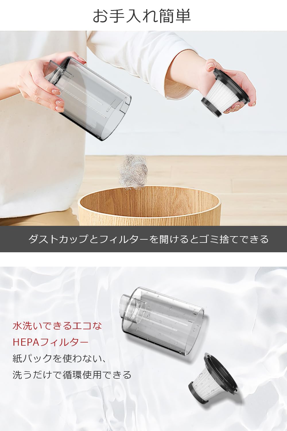 ダストカップはワンタッチで取り外せる簡単構造で、水洗い可能なので常に清潔を保てます。