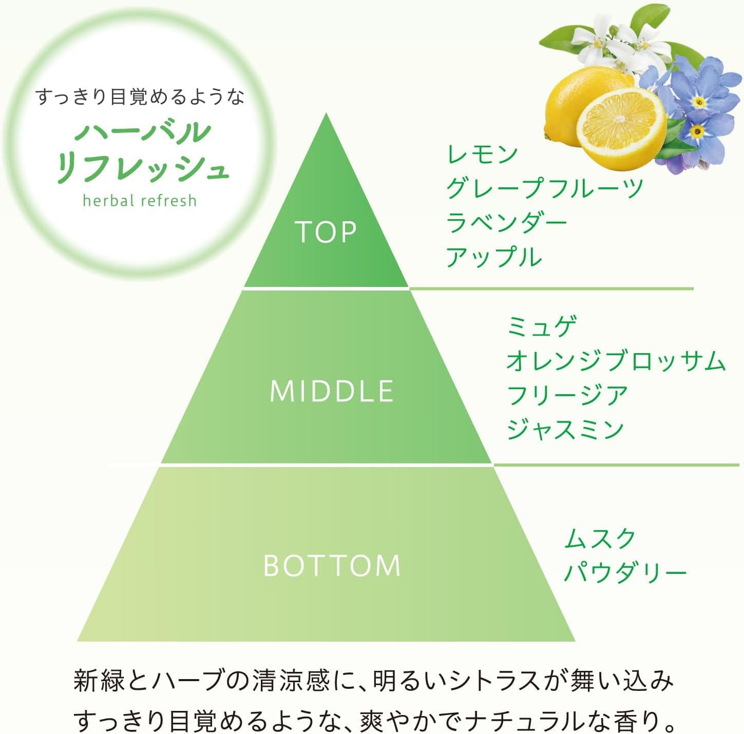 * 【ハーバルリフレッシュ】新緑とハーブの清涼感に、明るいシトラスが舞い込みすっきり目覚めるような、爽やかでナチュラルな香り。