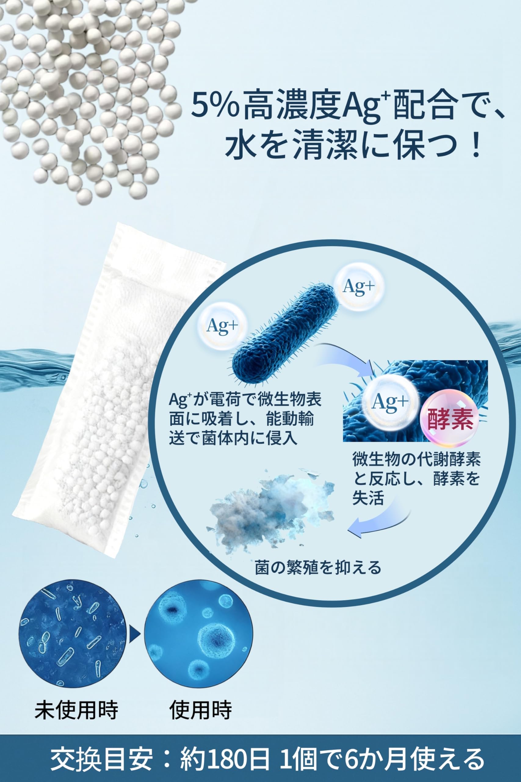 * 【銀イオン濃度5%、より確かな除菌力で水をきれいに】本製品の核心は、セラミック粒子に配合された高濃度5%の銀イオン(Ag+)です。銀イオンが水中に溶け出し、加湿器タンク内の雑菌の活動を抑制。カビやぬめりの発生を防ぎ、水を常に衛生的な状態に保ちます。化学成分を含まない物理的な除菌方法なので、安心してご使用いただけます。