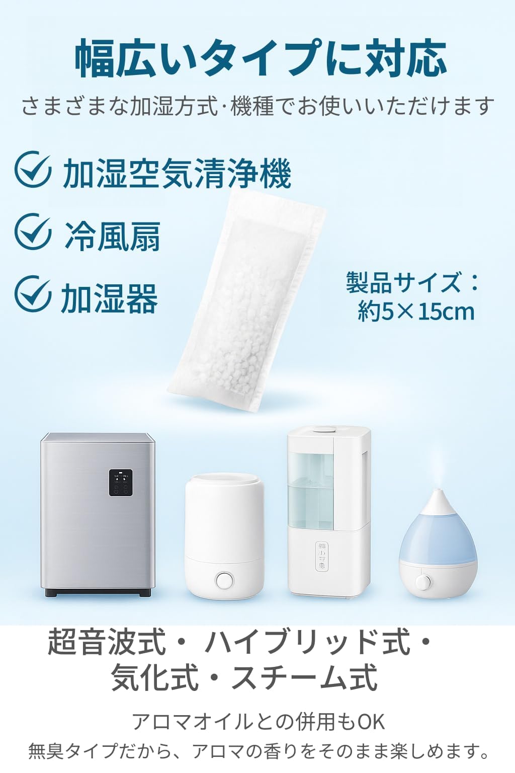 * 【長期間効果が持続。加湿器のメンテナンスを楽に】1パックで約180日間、除菌・抗菌効果が続きます。タンク内の雑菌の繁殖を根本から抑えることで、面倒なタンクのぬめり掃除の頻度を減らし、日々のメンテナンスを楽にします。超音波式、気化式、ハイブリッド式など、タンクのあるほとんどの加湿器や冷風扇にご使用いただけます。