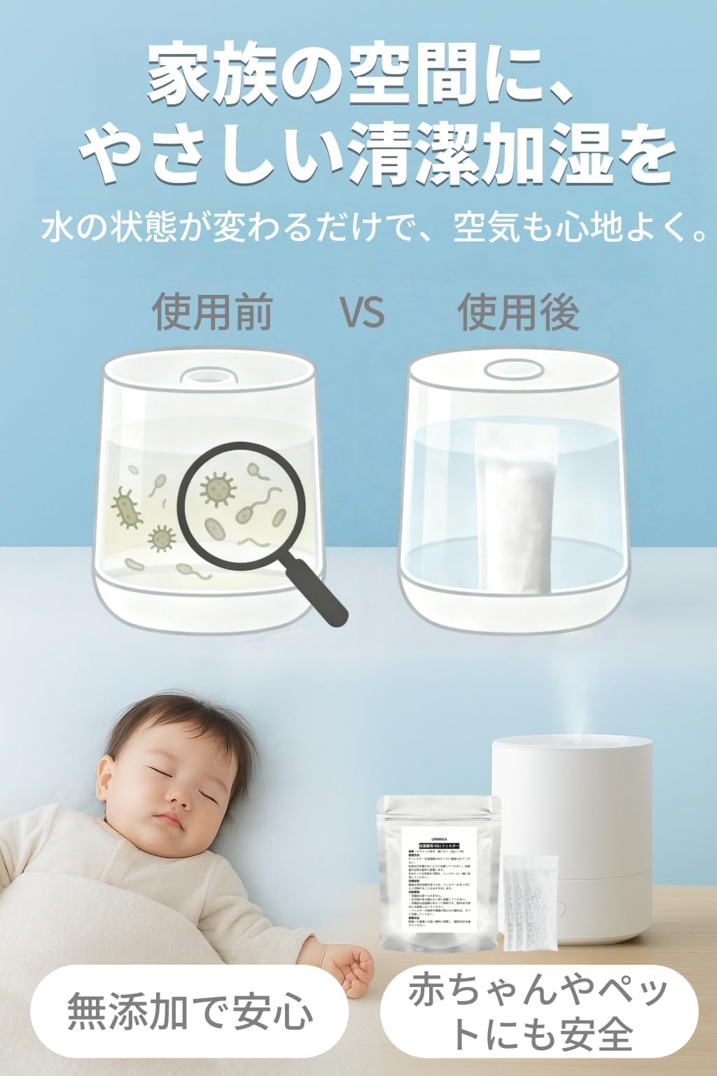 * 【加湿器タンクの衛生、見直しませんか?カビが繁殖しやすい場所です。特に、水を注ぎ足して使う習慣は、タンク内の「ぬめり」や不快な臭いの原因となります。本製品は、そのようなお悩みを解決するために開発されました。タンク内に入れるだけで水質を清潔に保ち、ご家族が安心して過ごせる空気環境作りをサポートします。