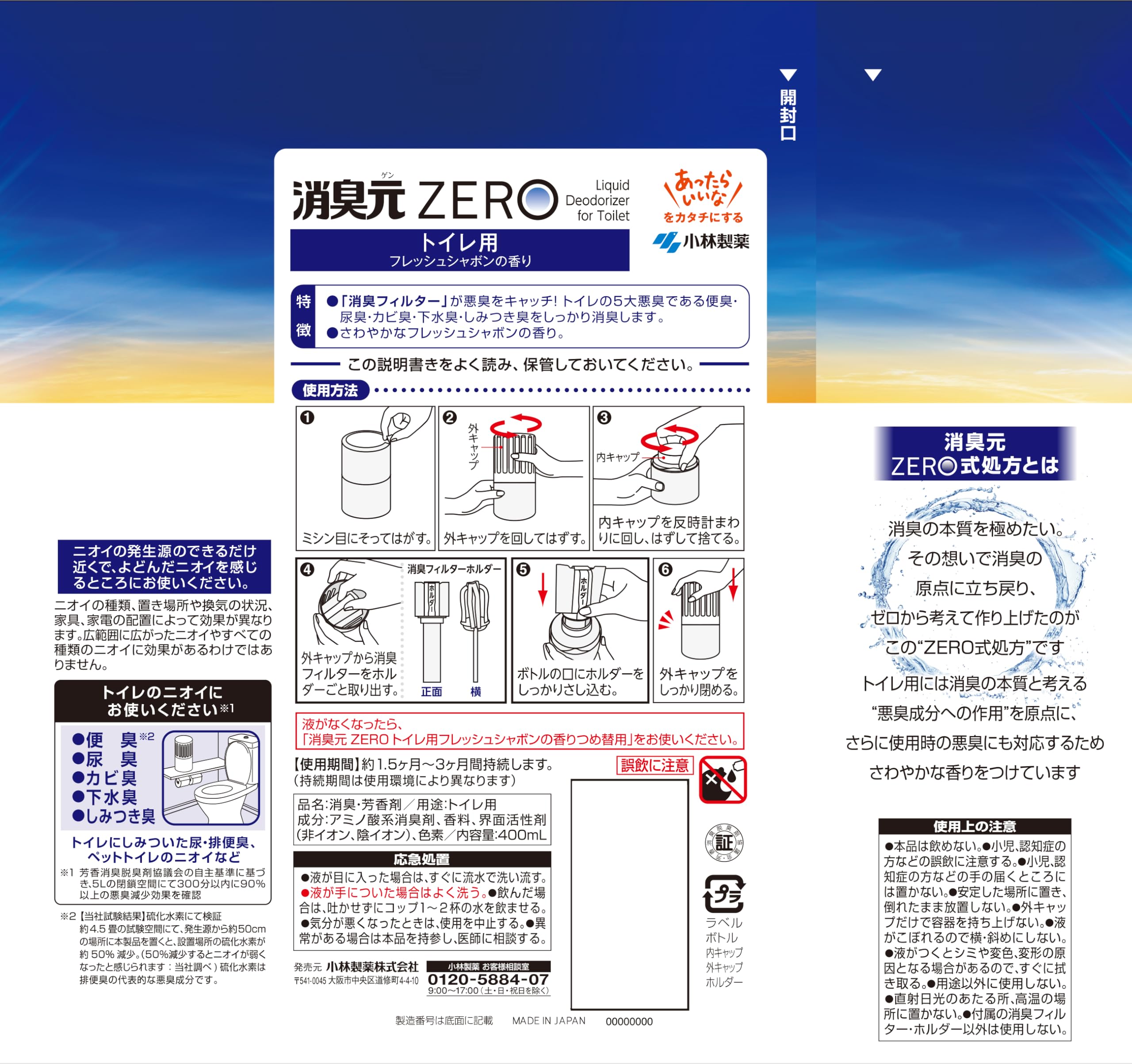 * ●「消臭フィルター」が悪臭をキャッチ!トイレの5大悪臭である便臭・尿臭・カビ臭・下水臭・しみつき臭に効く●フレッシュシャボンの香り●消臭元ZERO式処方とは、消臭の本質を極めたいという想いで消臭の原点に立ち戻り、ゼロから考えて作り上げた処方です。 トイレ用には消臭の本質と考える”悪臭成分への作用”を原点に、さらに使用時の悪臭にも対応するためさわやかな香りをつけています●本体と詰め替えがあります●大容量400mL×3個パック