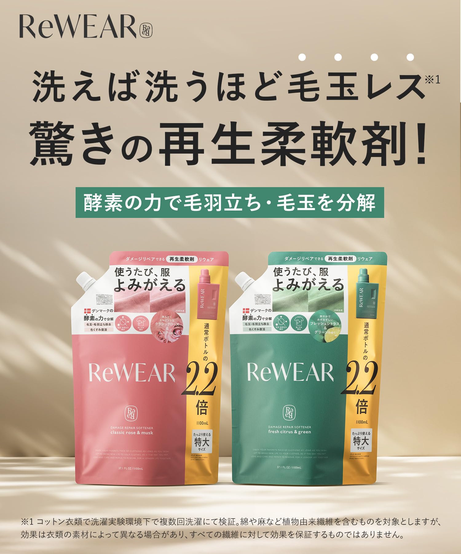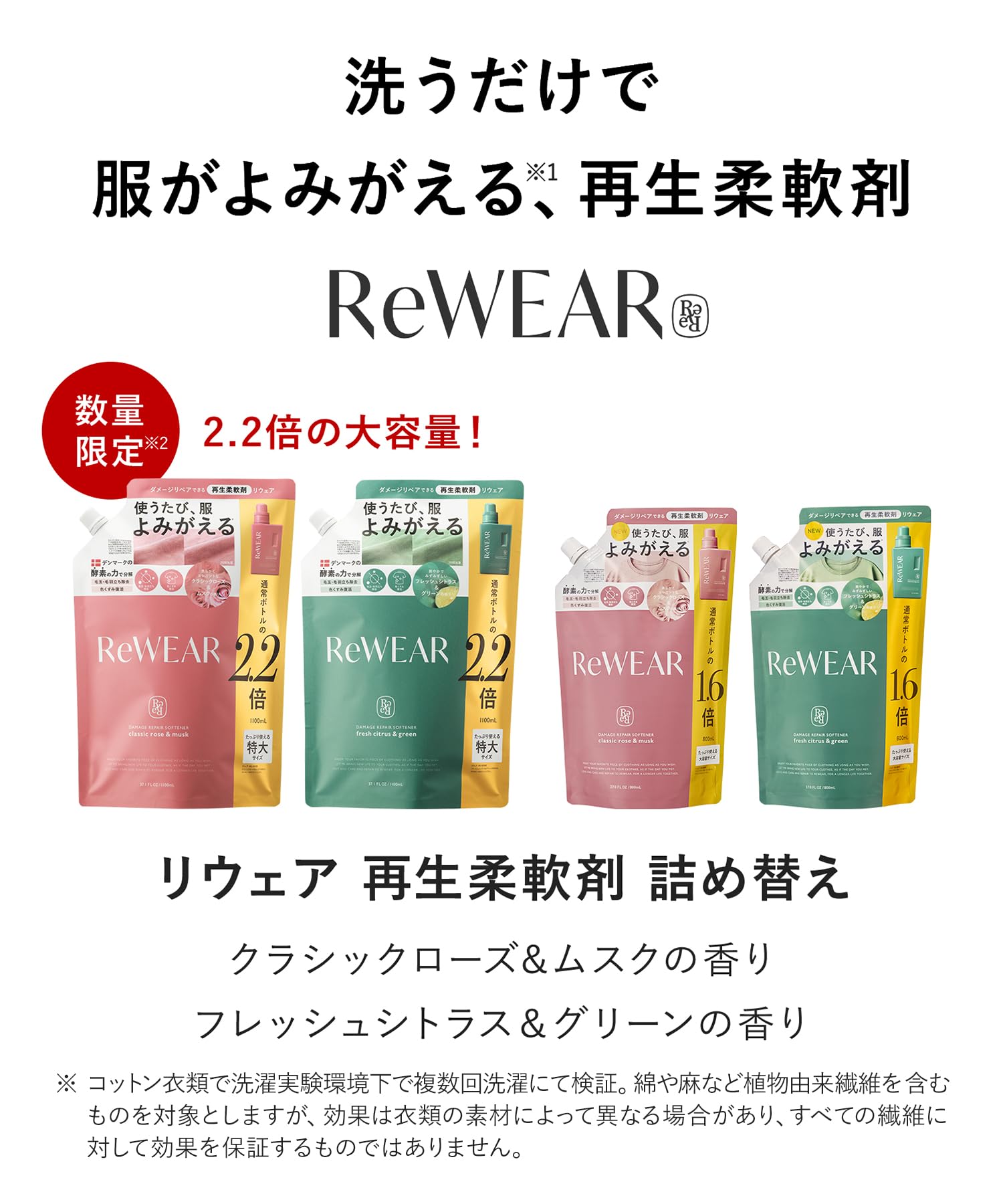 ReWEAR リウェア 再生 柔軟剤 大容量 詰め替え 3点セット クラシックローズ&ムスク 【通常ボトル2.2個分】