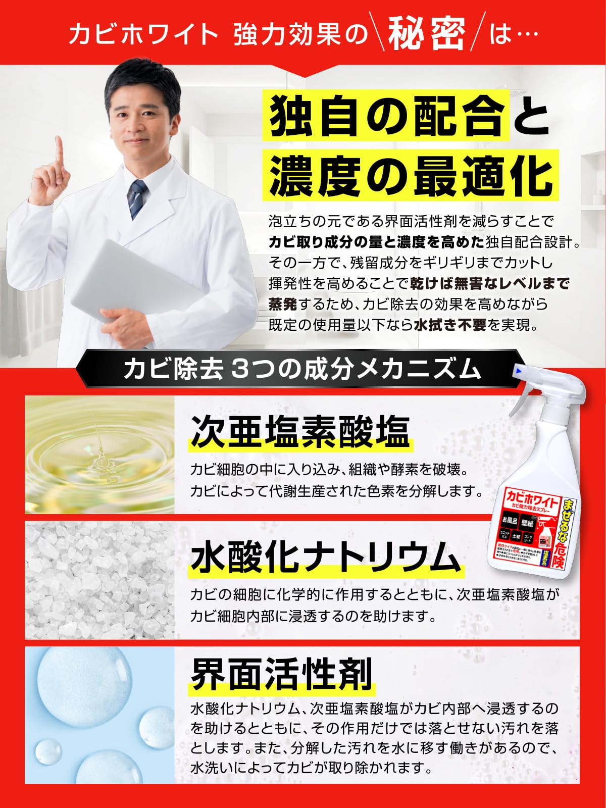 * 目に見えないカビの菌糸や薬品に耐性を持った塩素耐性菌まで除去するため、次のカビが生えづらく最長3か月程度の防カビが期待できます。
