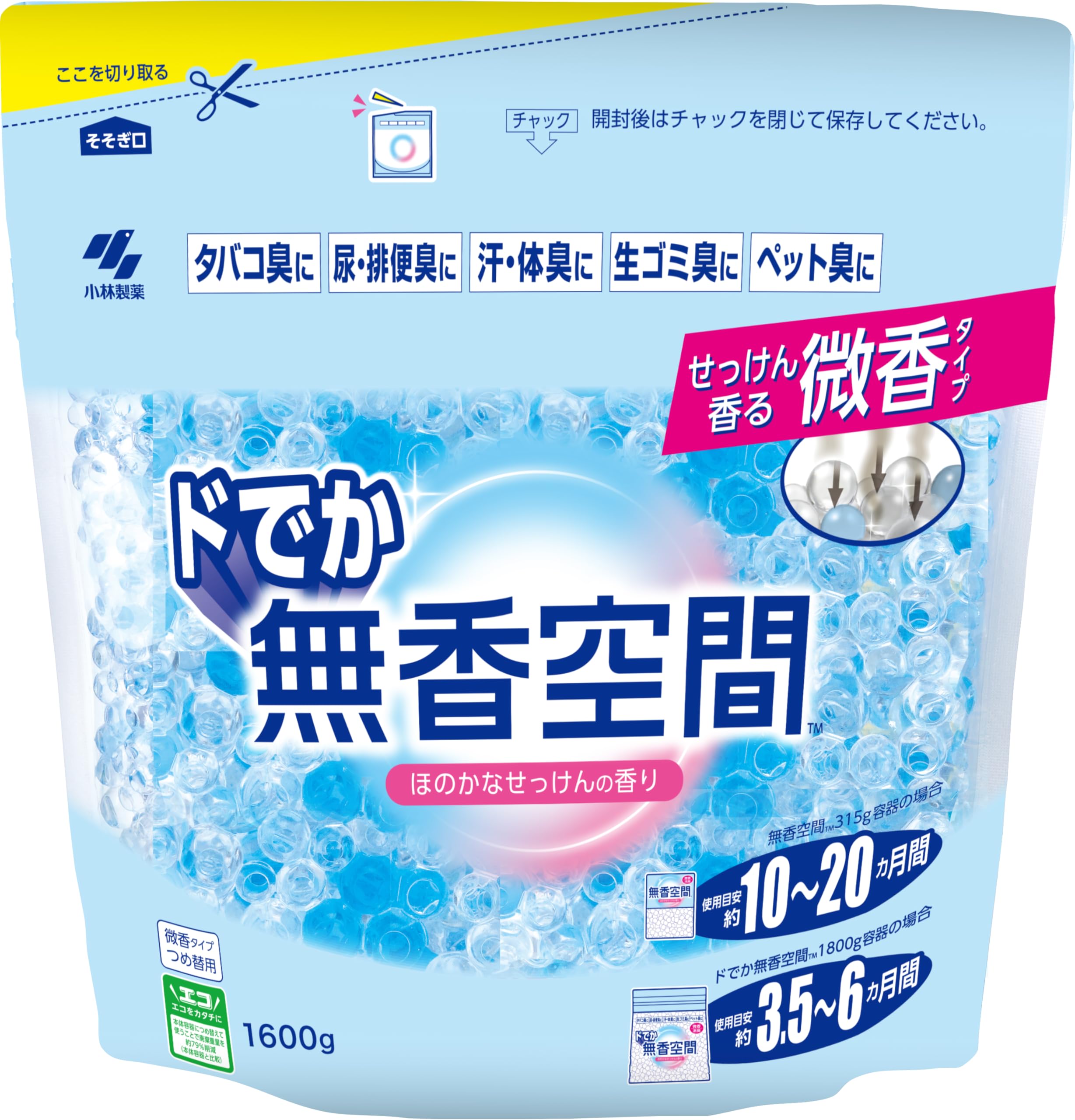 無香空間 置き型 消臭剤 【 消臭ビーズ でしっかり 消臭 】 部屋 玄関 靴箱 下駄箱 クローゼット トイレ ペット のニオイにも 小林製薬 微香(ほのかなせっけんの香り)ドでか 詰替え 1600g