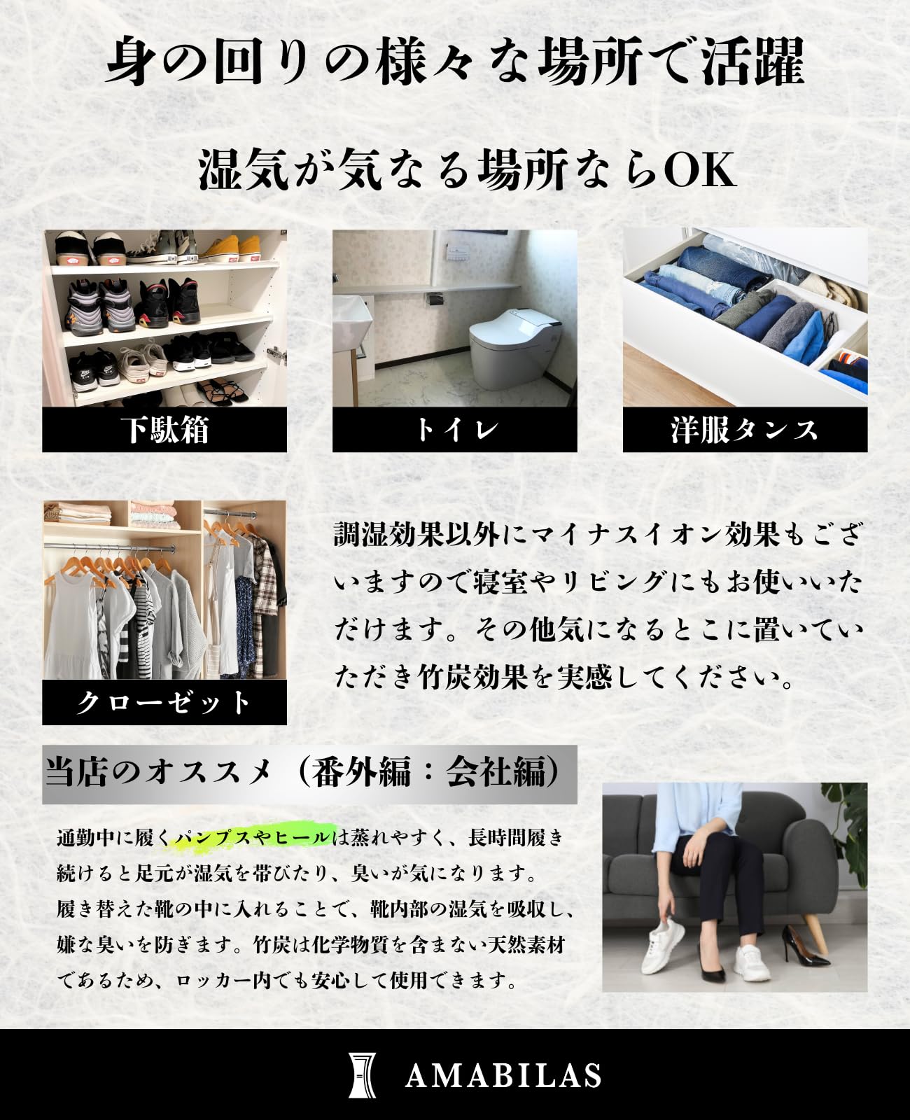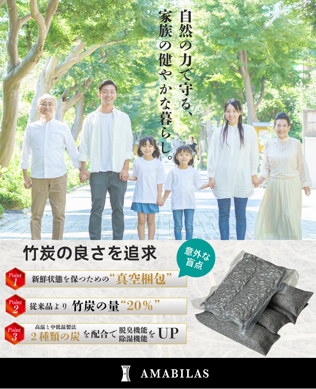 * AMABILAS(アマ-ヴィラス) 活き竹炭 脱臭 除湿 真空梱包 12個セット 内容 (75g×6個、取扱説明書) サイズ:縦約18cm×横約7cm×厚み約4cm ※個体差がある場合がございます。