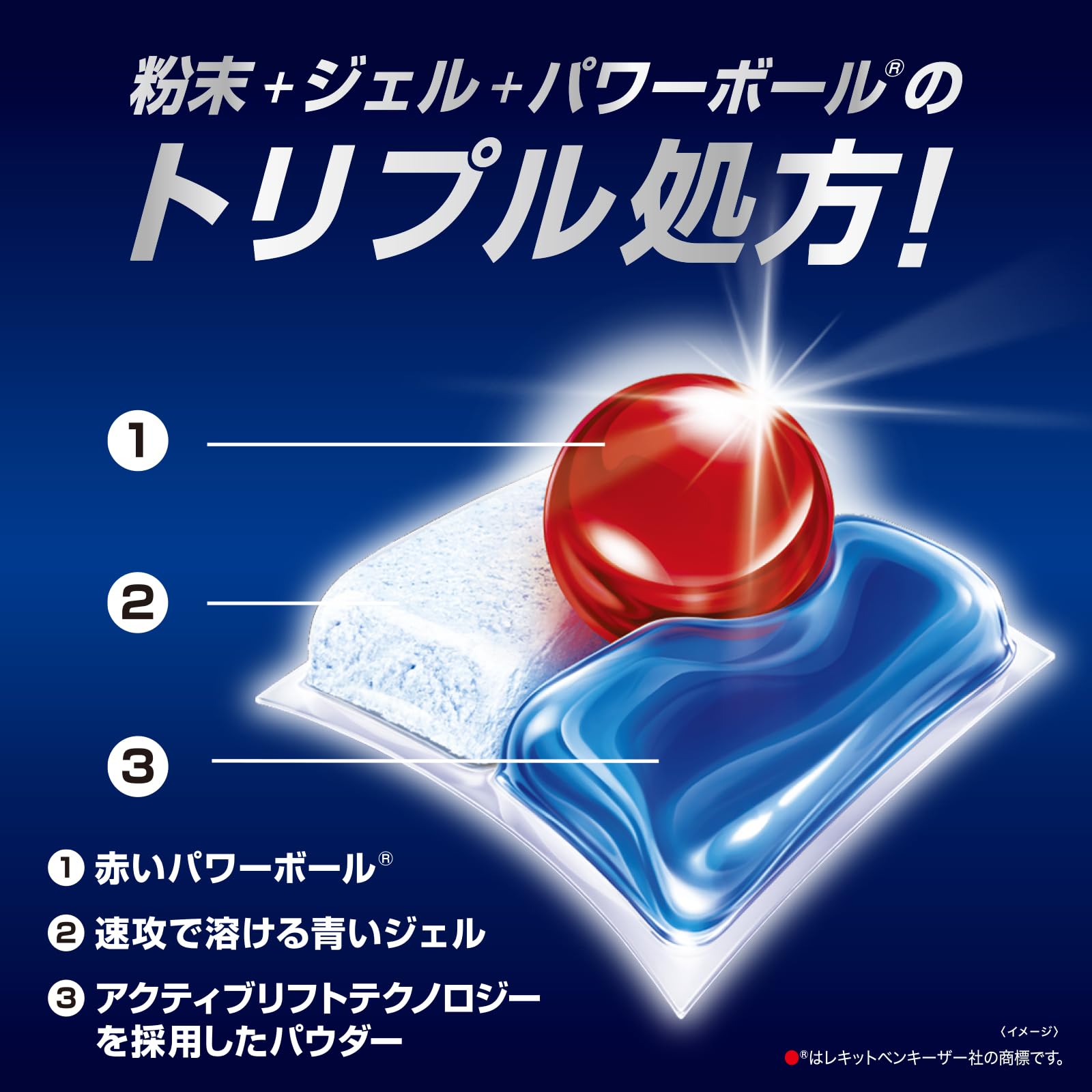 * 24時間放置して乾燥・こびりついたしつこい汚れでさえも、予洗いなし(※1)でしっかり落とす。粉末+ジェル+パワーボールのトリプル処方。※1…食べこぼしなどの固形物は、食洗機に入れる前に取り除いてください。