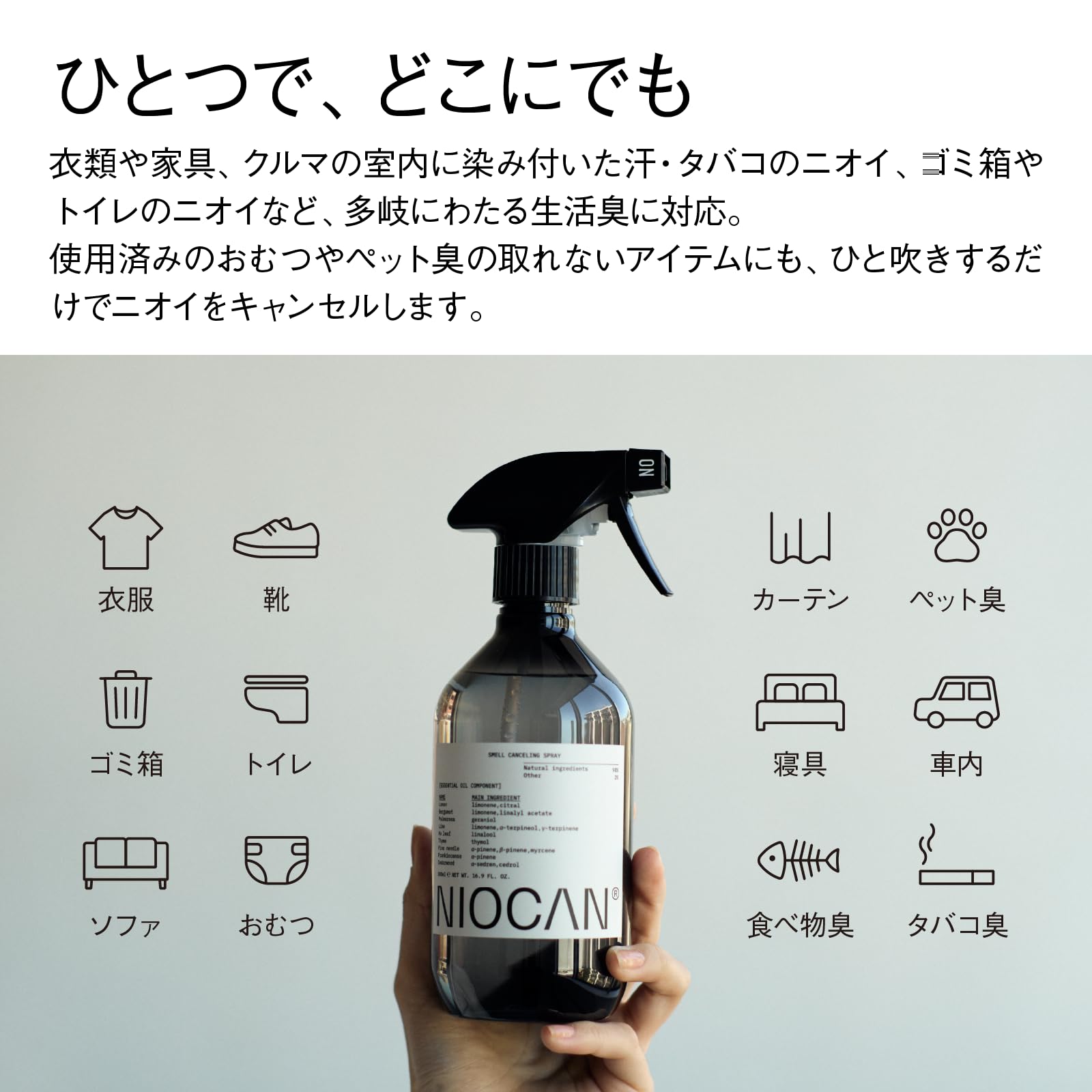 * 【暮らしを整える消臭】ニオキャンは、多様な生活臭に合わせて天然精油を独自に配合。ひと吹きするだけで、素早くニオイをキャンセルします。