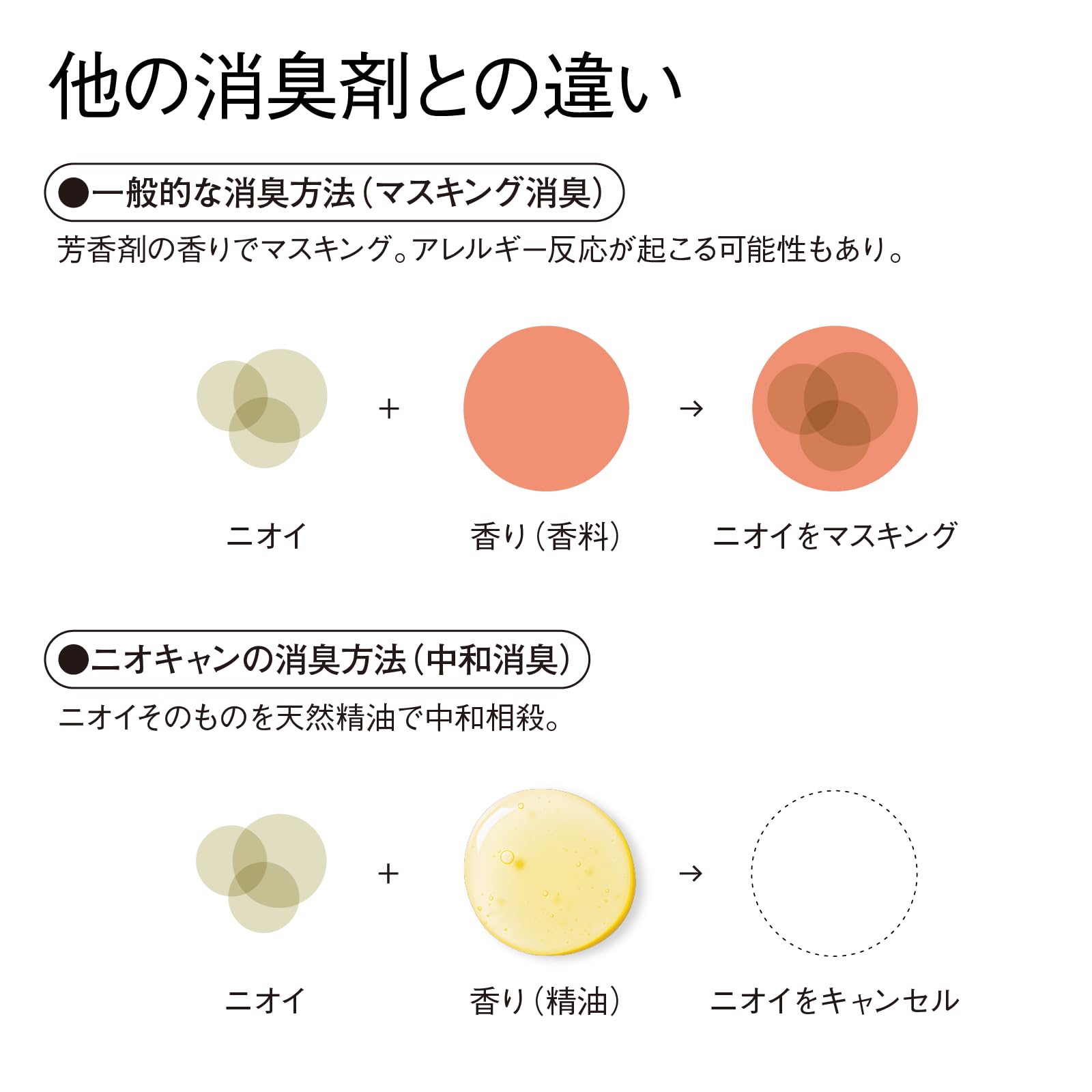 * 【ニオイを打ち消す臭気判定士の技術】気になるニオイを香りでごまかす(マスキング)のではなく、天然精油が持つ成分で打ち消して無臭化するニオキャンの「中和消臭技術」。それを実現しているのが、ニオイのプロフェッショナルである臭気判定士の技術です。