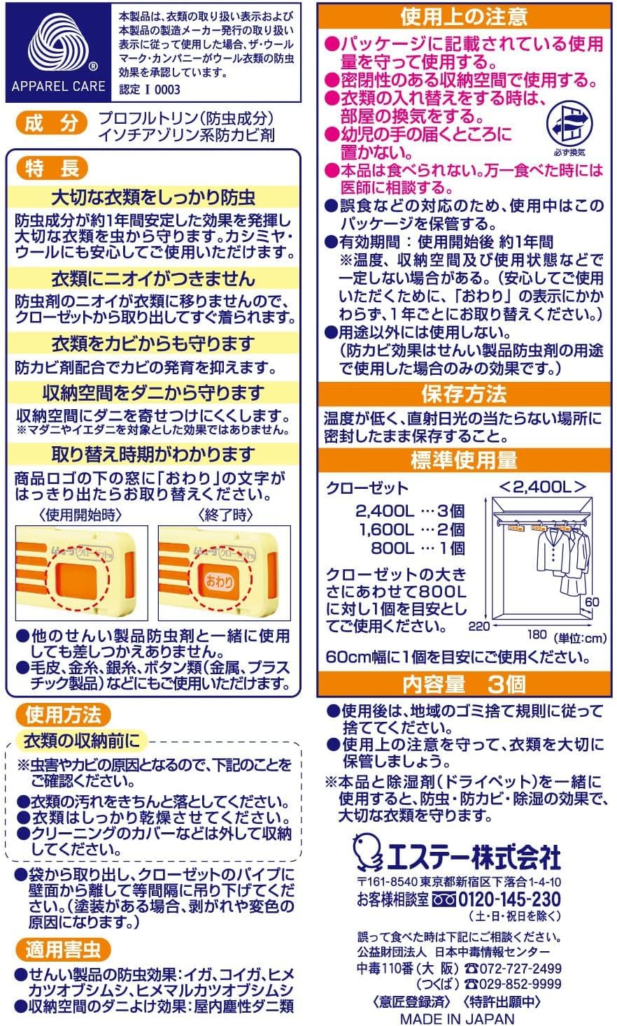 * 【用途】せんい製品防虫剤 クローゼット用