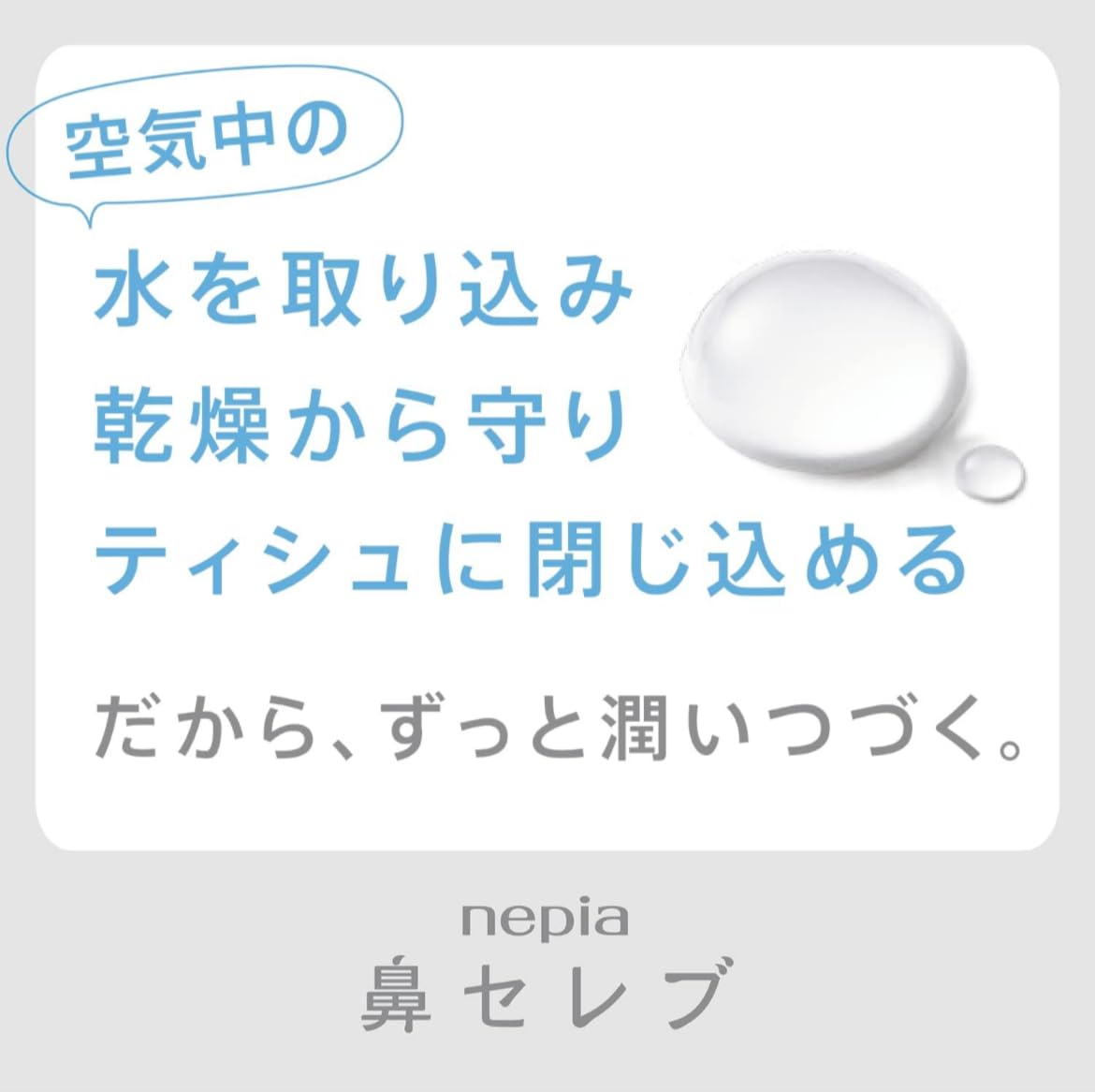 * ネピア独自の「トリプル保湿」と「植物性スクワラン」がティシュの中に空気中から水分を取り込み、まるで潤いのベールをまとったような肌触り