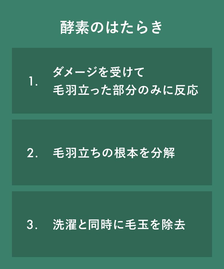 * 【革新的技術】デンマーク開発の酵素成分「セルラーゼ」配合で、毛玉・毛羽立ちを分解して衣類を再生。購入時の状態に近づける新発想の柔軟剤です。