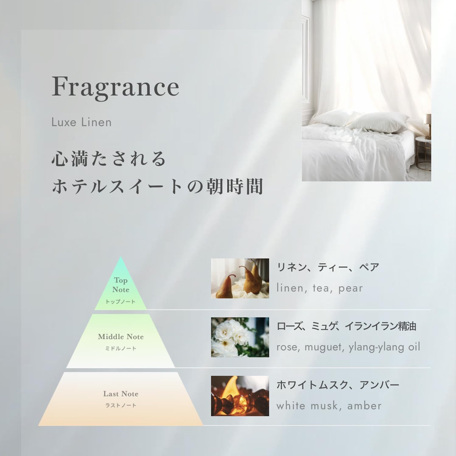 * 爽やかな朝を感じるリネンにミュゲやホワイトムスクが重なる、リュクスリネンの香り