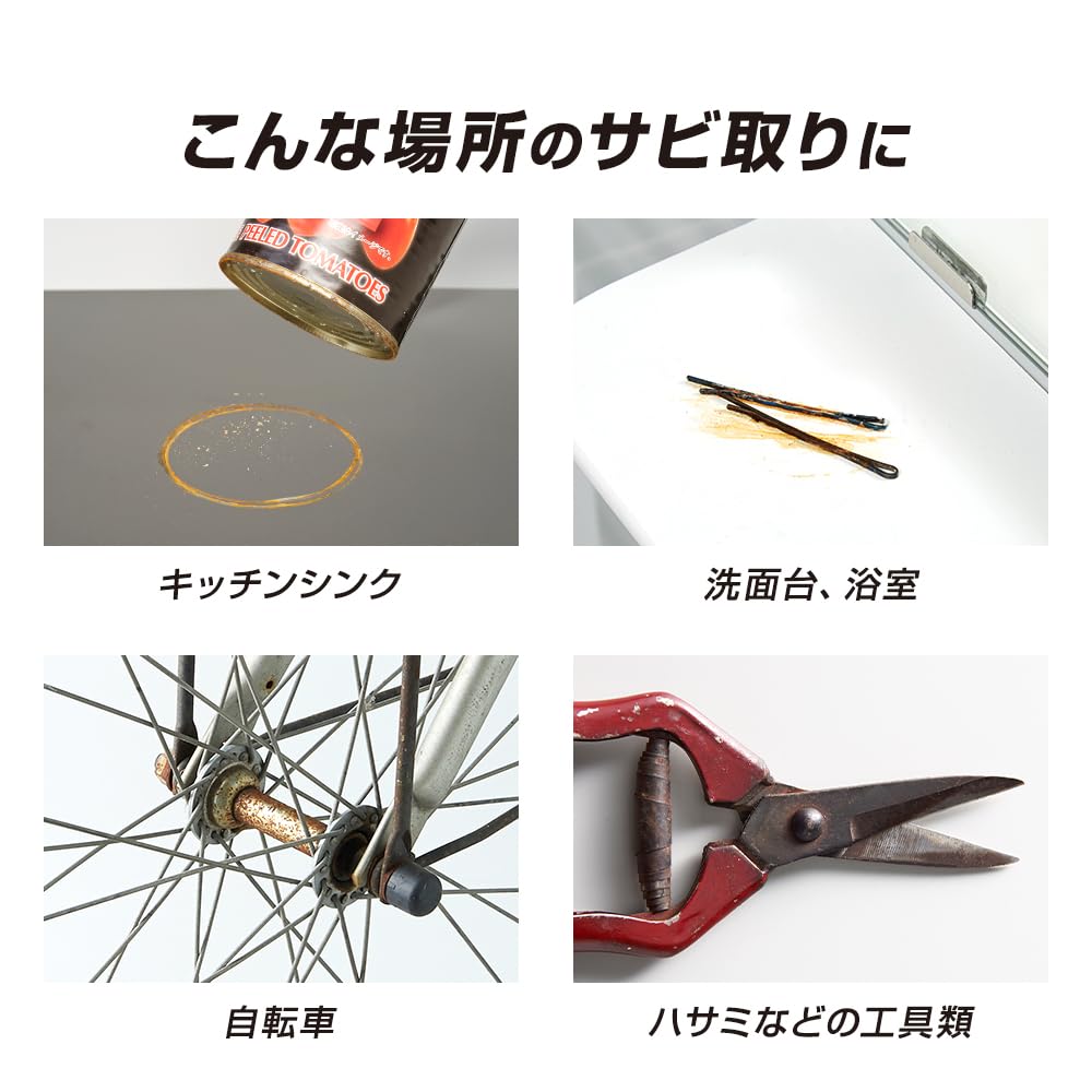 * 【いろいろなサビに】自転車・鎌・ハサミ・工具等の頑固なサビに。キッチンシンク・洗面台・浴室等、陶器・プラスチック素材に移ってしまった「もらいサビ」にも。