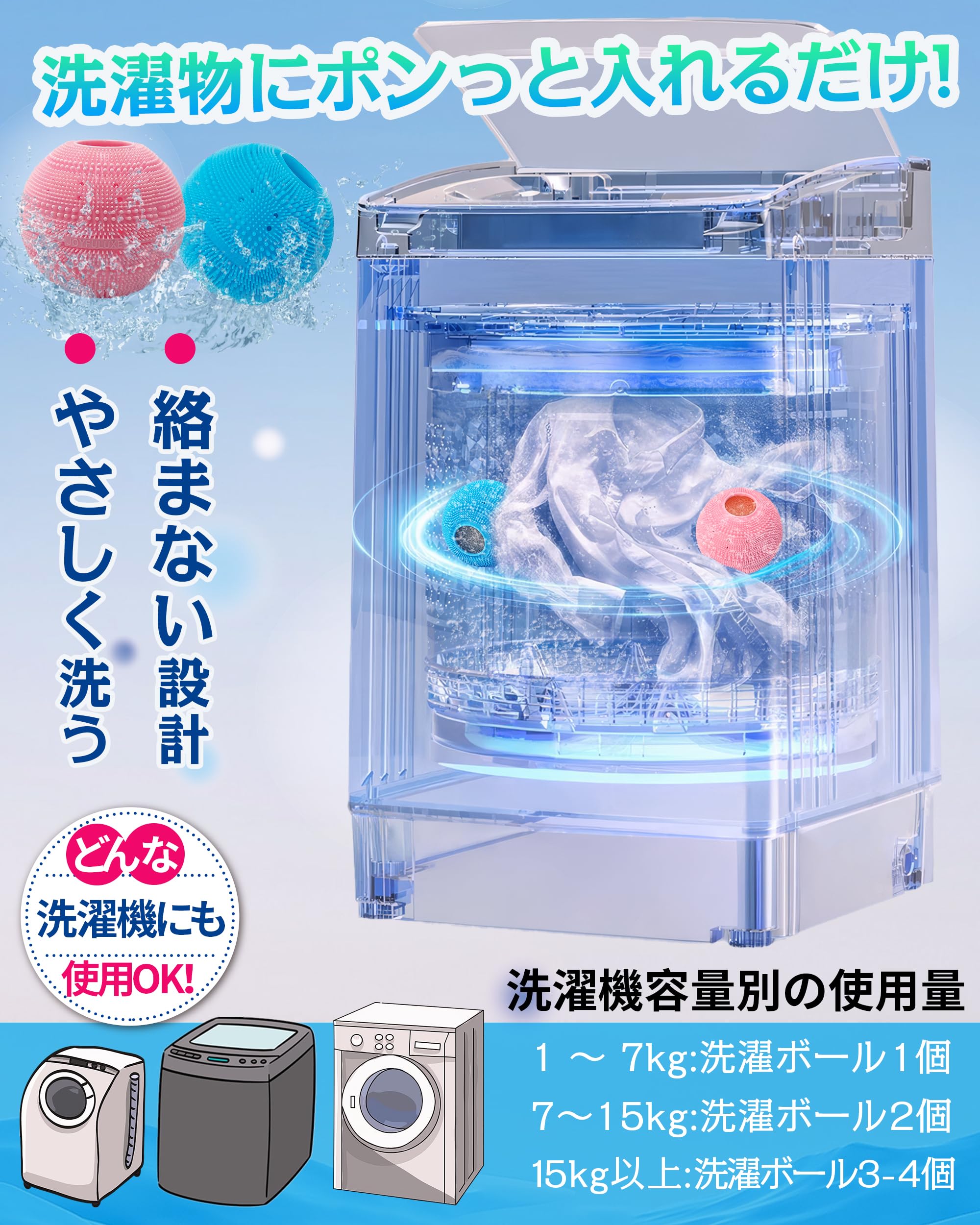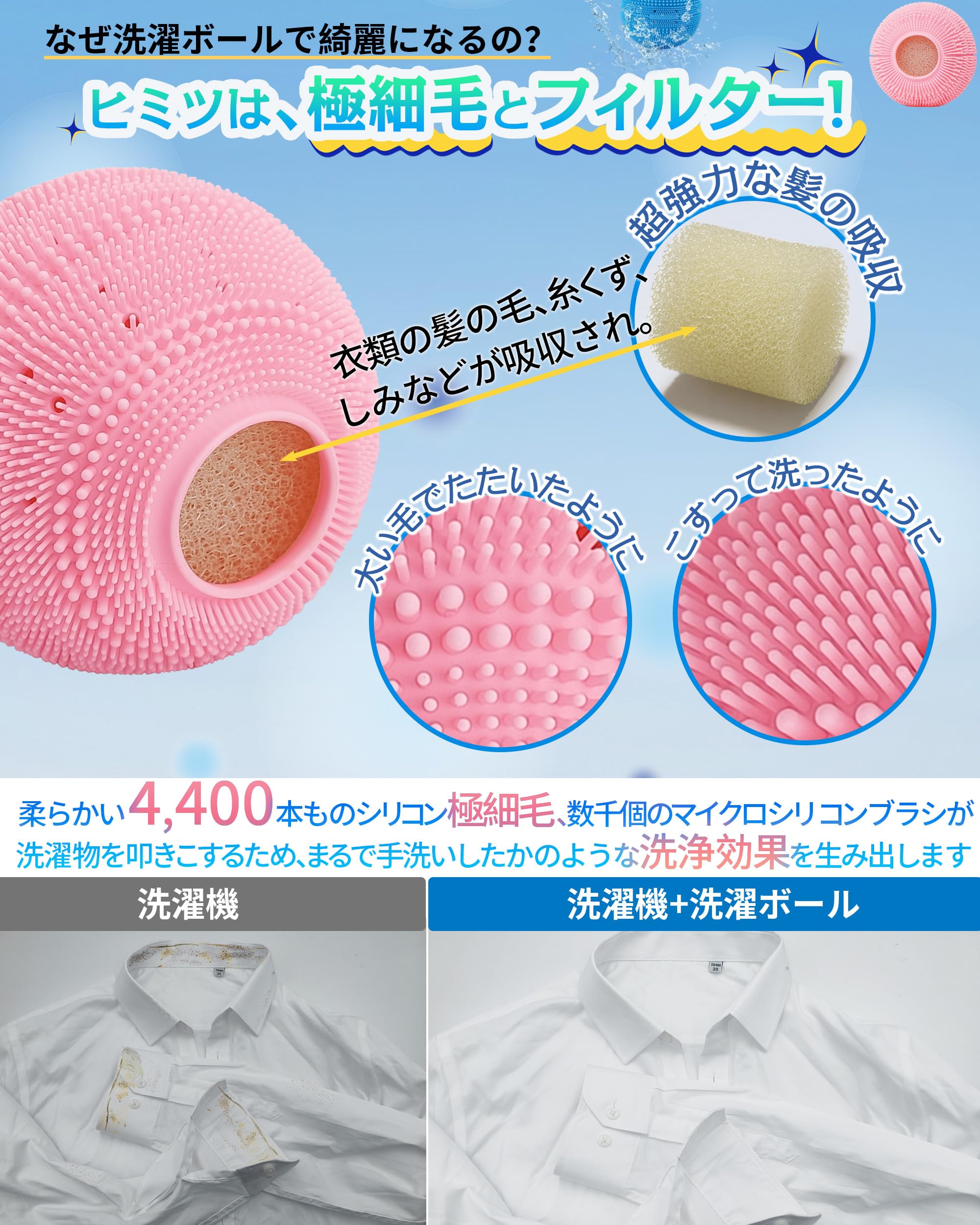 * 【洋服にやさしい素材】: 洗濯ボールは、安全で柔軟なシリコン素材で作られており、洗濯物にやさしいです。シリコン素材の極細毛が、手洗いのような効果的な洗浄を実現します。毎日の洗濯物をフンラン上にするヒミツはボールの柔らかさにもこだわりが。