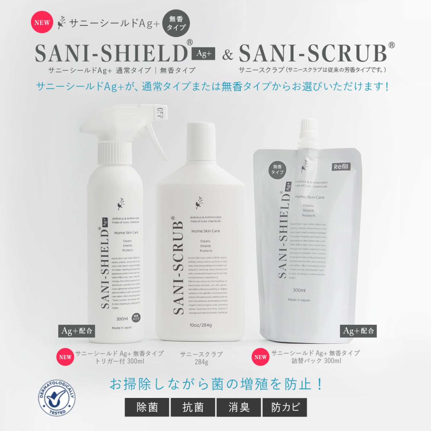 SANI-SHIELD サニーシールドAg+ 除菌スプレー クリーナー 中性 抗菌コーティング ウィルス 花粉 消臭 防カビ お掃除 洗浄 撥水 艶 ツヤ 手に優しい 古堅純子 銀イオン ペット臭 日本製 トリガー1本+詰替1袋+スクラブ1本 無香料