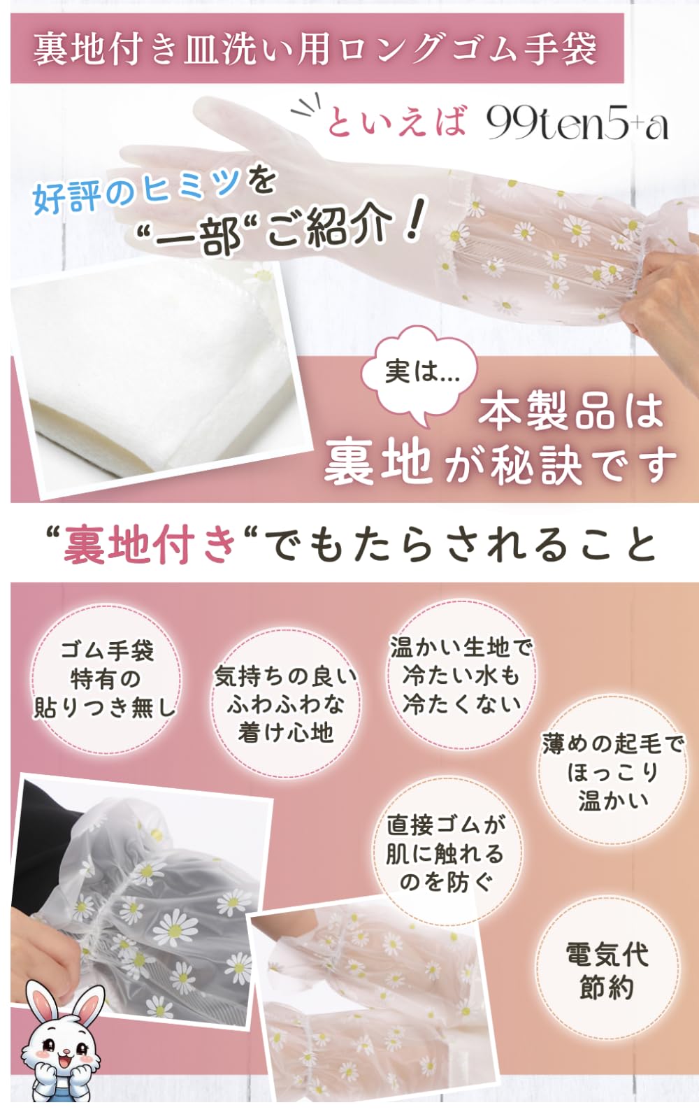* 【③”ラテックスフリー”な使い心地】 ・敏感肌の方も安心してお使いいただけるよう、手袋部分はラテックスを含まないPVC素材を使用 ・洗剤やお湯からしっかりと手を保護しながら、かゆみやかぶれといったアレルギーの心配も軽減 ・どなたでも安心してお使いいただけます