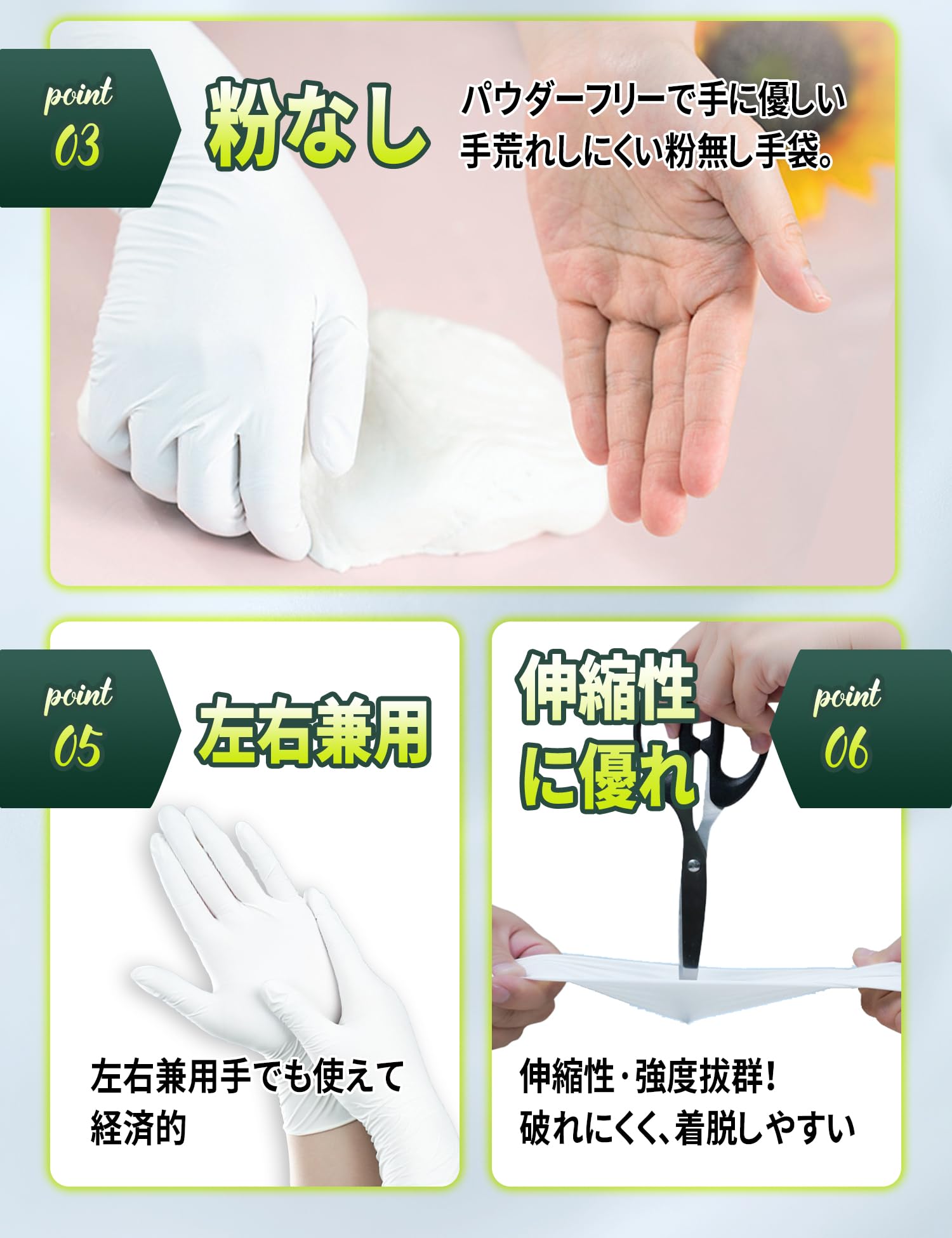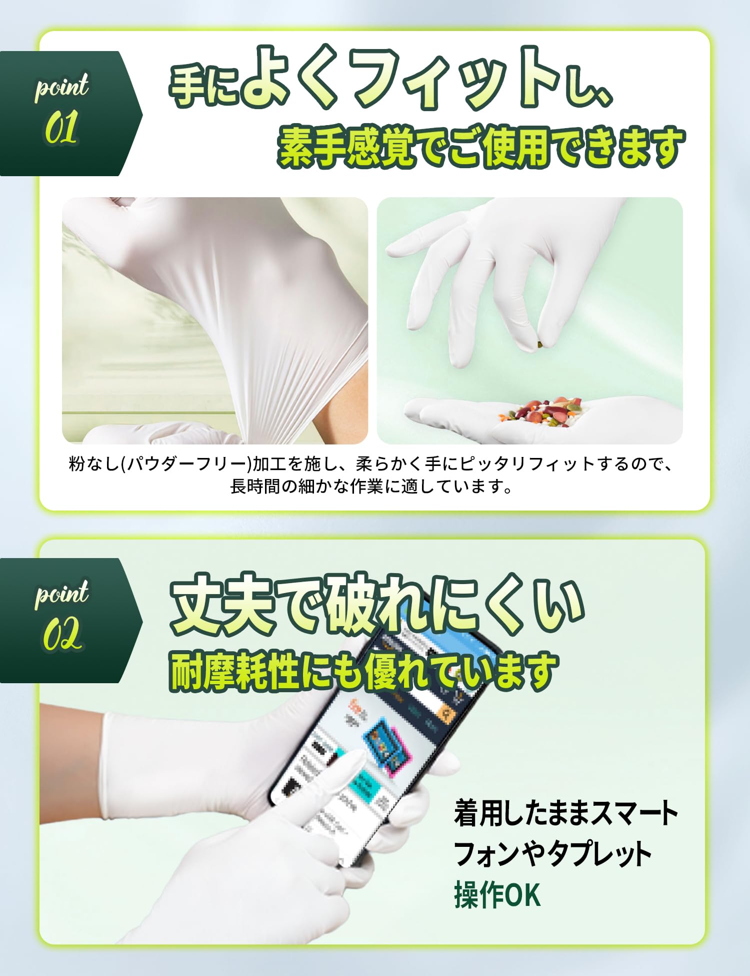 * 【粉なしデザイン&タッチパネル対応】 ニトリル手袋は粉なしデザインを採用しており、皮膚アレルギーや汚染のリスクを効果的に減少させます。 タッチパネル対応で、つけたままタブレット・スマホの操作OK!